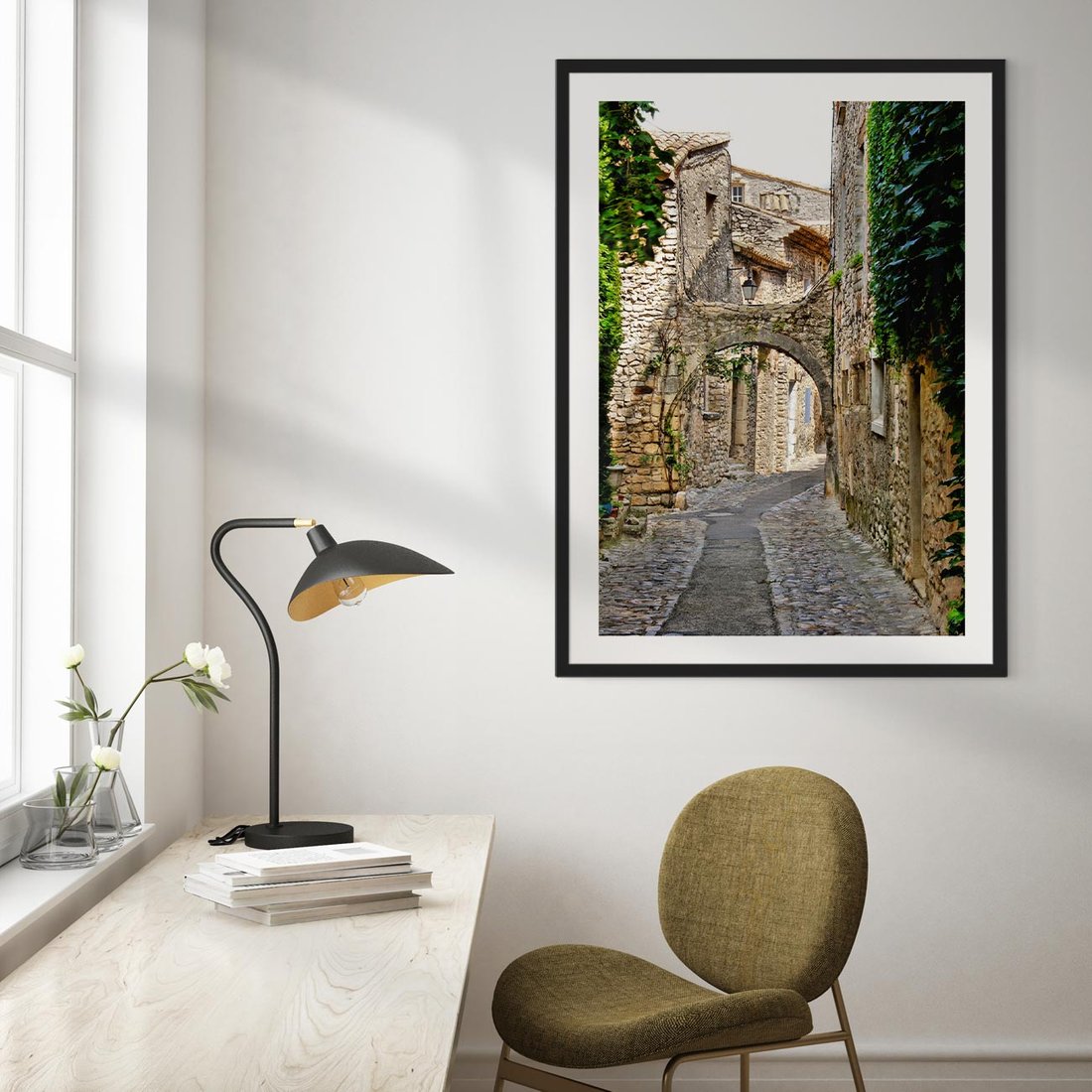 Przenieś się do urokliwej uliczki w perspektywie dzięki temu uroczemu obrazowi. Z kolorowymi fasadami i artystycznym nastrojem, ożywia przestrzeń. Ta kompozycja dodaje uroku i miejskiego charakteru, idealna dla miłośników spacerów po urokliwych uliczkach i architektury.