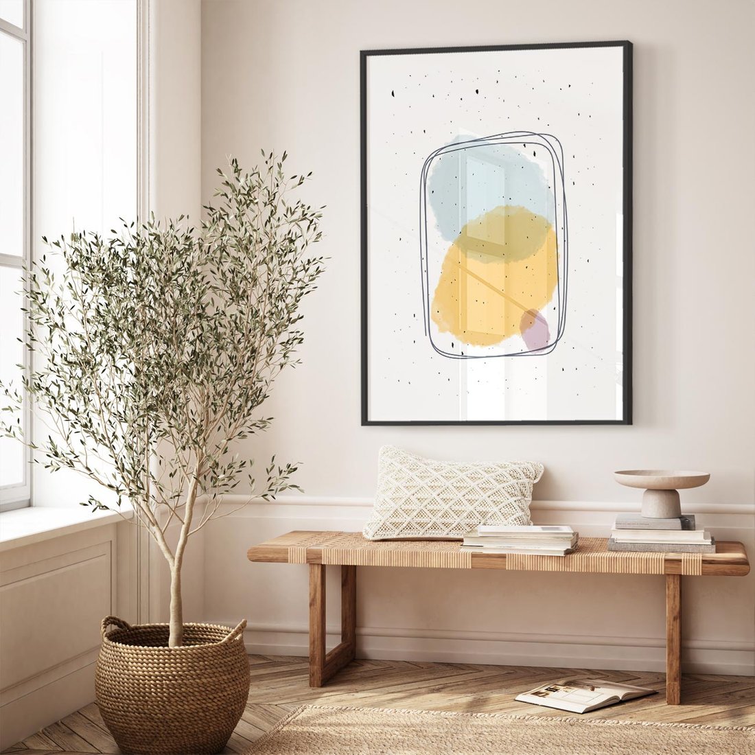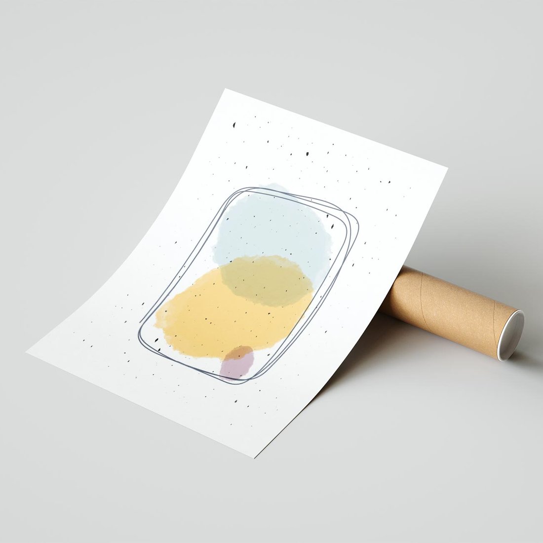 Wyjątkowa abstrakcja o charakterze ręcznie malowanego dzieła. Wypełniona delikatnymi plamami akwarelowymi, swobodnymi nieregularnymi kreskami i efektownymi plamkami.
