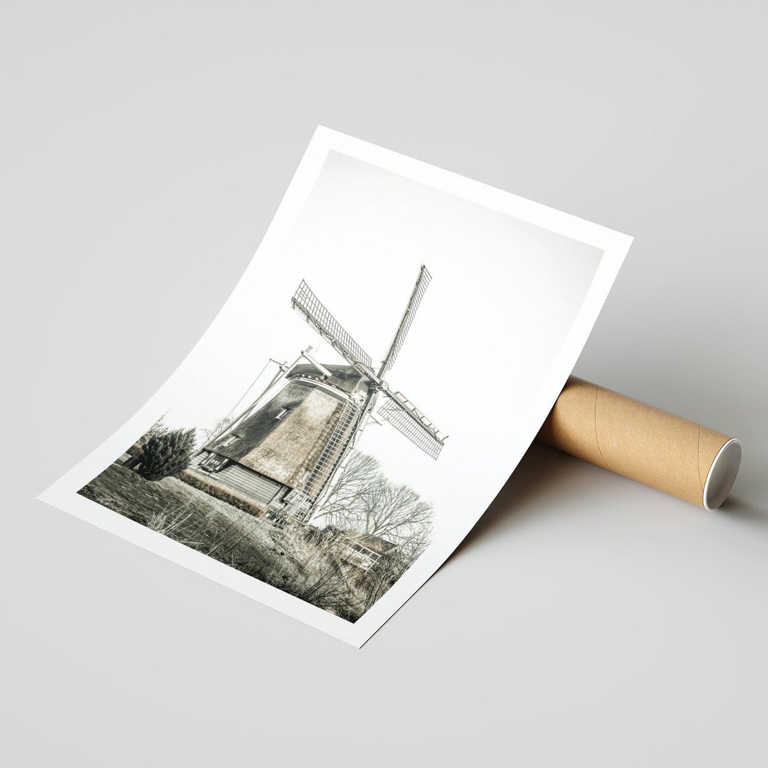 Obraz przedstawia wiejski krajobraz z wiatrakiem lub młynem w odcieniach sepii, co nadaje mu nostalgiczny i klasyczny charakter.