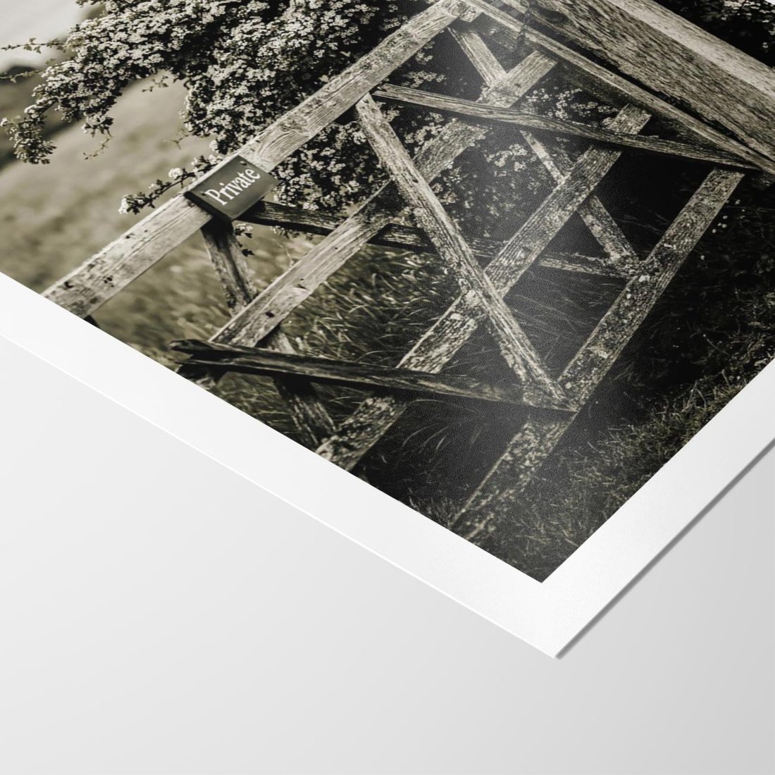 Plakat bez ramy 50x70 - Wiejski Urok: Stary Płot i Kwitnący Krzew - rustykalne zdjęcie, stary płot