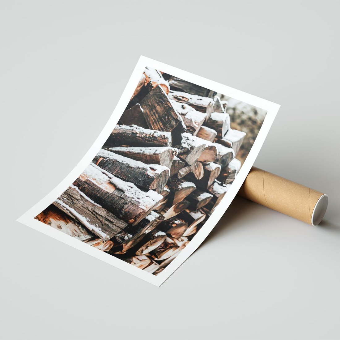 Plakat bez ramy 50x70 - Zimowa Drewniana Idylla - drewno, kłody