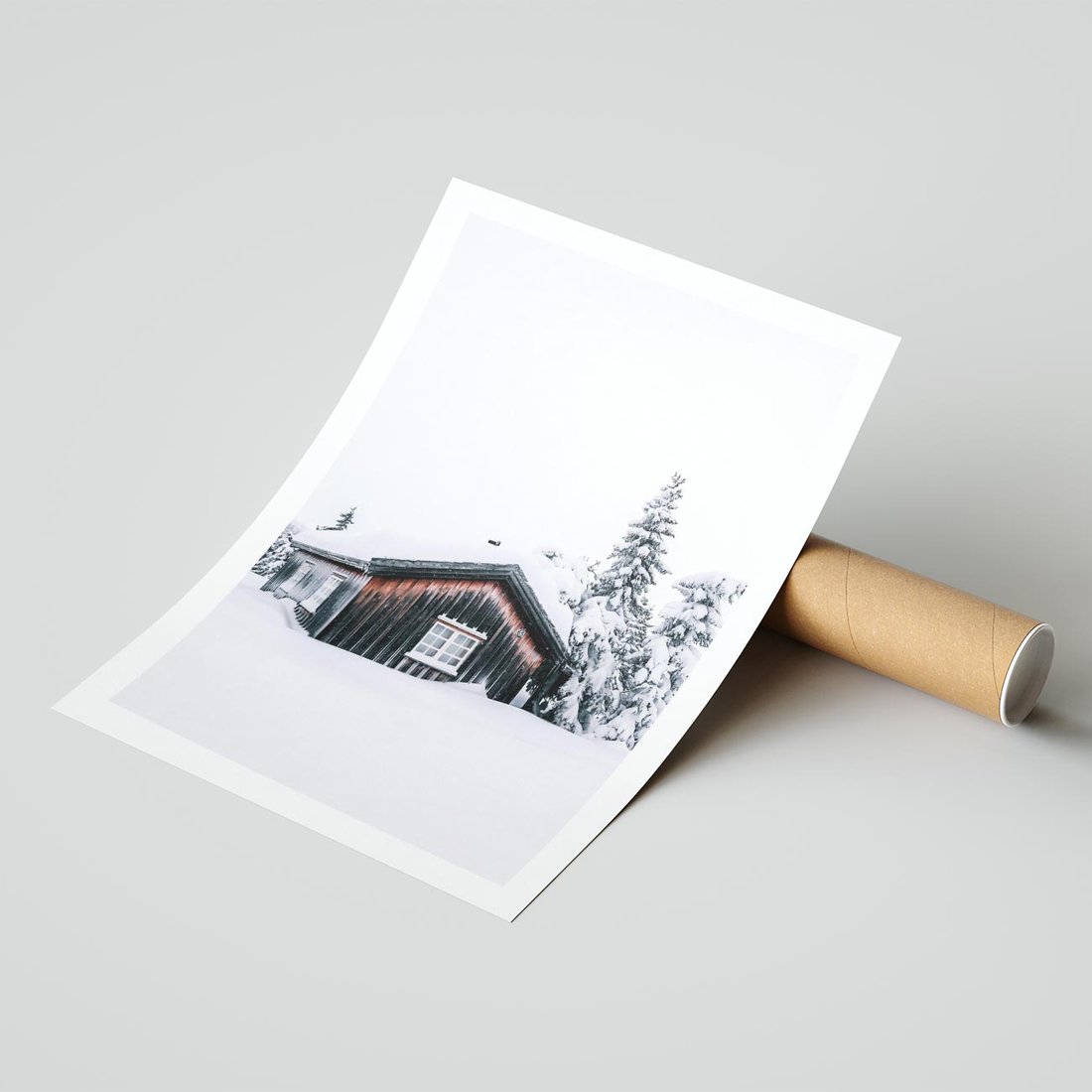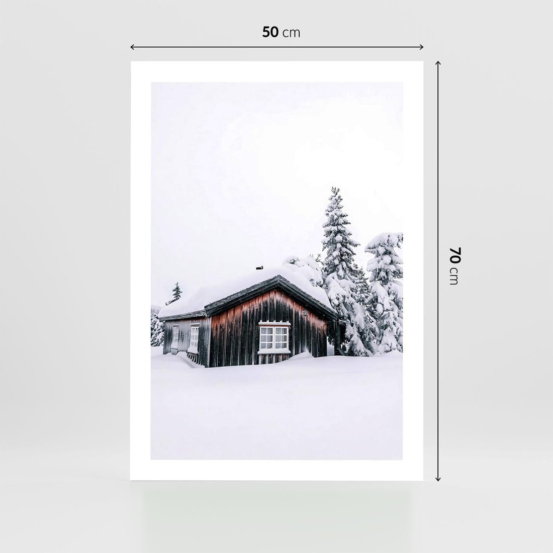 Plakat bez ramy 50x70 - Zimowy Azyl: Domek w Górach - domek w górach, śnieg