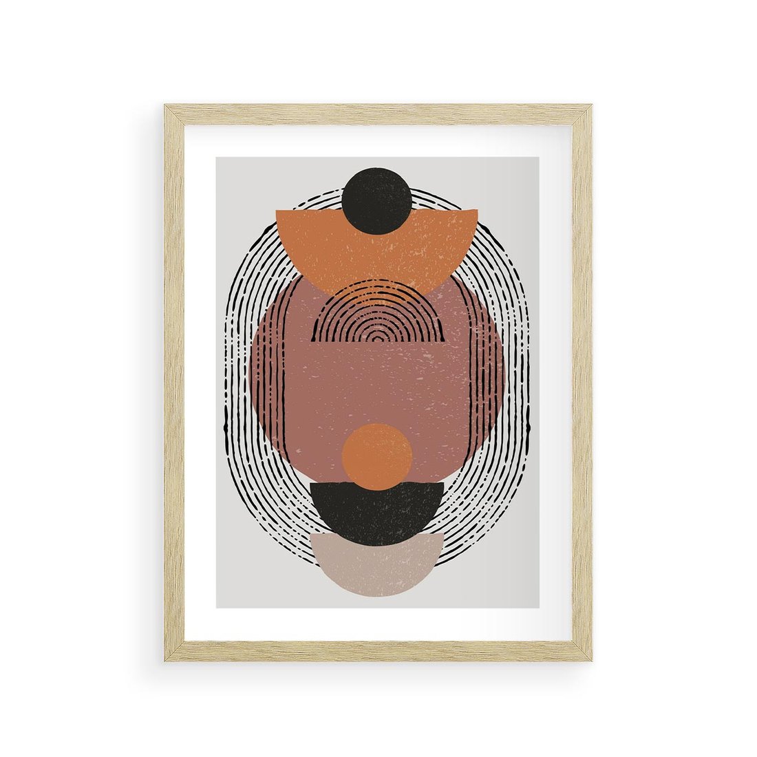 Obraz przedstawia abstrakcyjną grafikę z geometrią w odcieniach brązów i beży. Ta kompozycja artystyczna doskonale oddaje równowagę i spokój, idealnie pasując do wnętrz, które pragną wyrazić nowoczesność i harmonię.