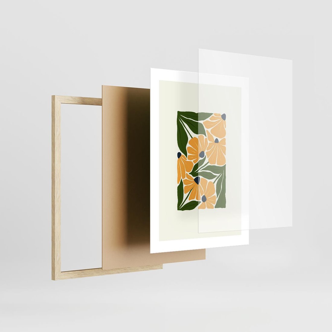 Ten minimalistyczny plakat oddaje piękno kwiatów i roślin w delikatnych pastelowych tonach. Kompozycja emanuje spokojem i harmonią natury, tworząc subtelny i estetyczny akcent w przestrzeni.
