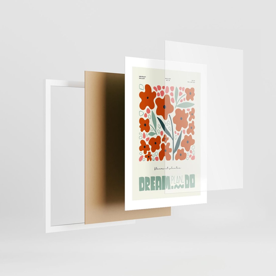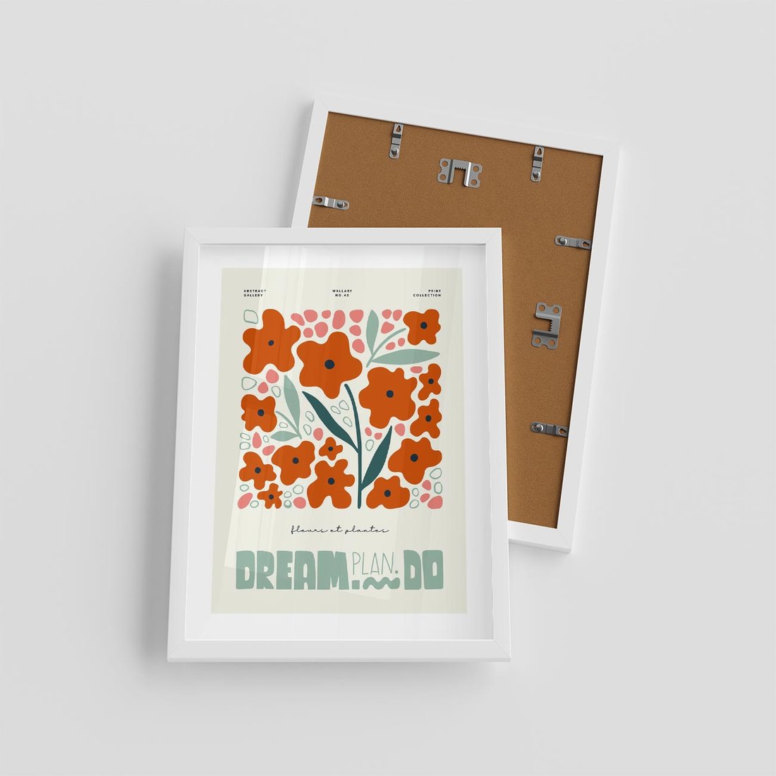 Ten nowoczesny plakat łączy abstrakcyjne kwiaty z efektowną typografią, tworząc dynamiczną kompozycję. Sztuka ta wyraża piękno natury w nowoczesnym wydaniu, zapraszając do refleksji i podziwiania detali.