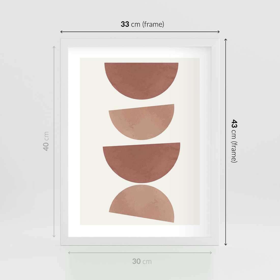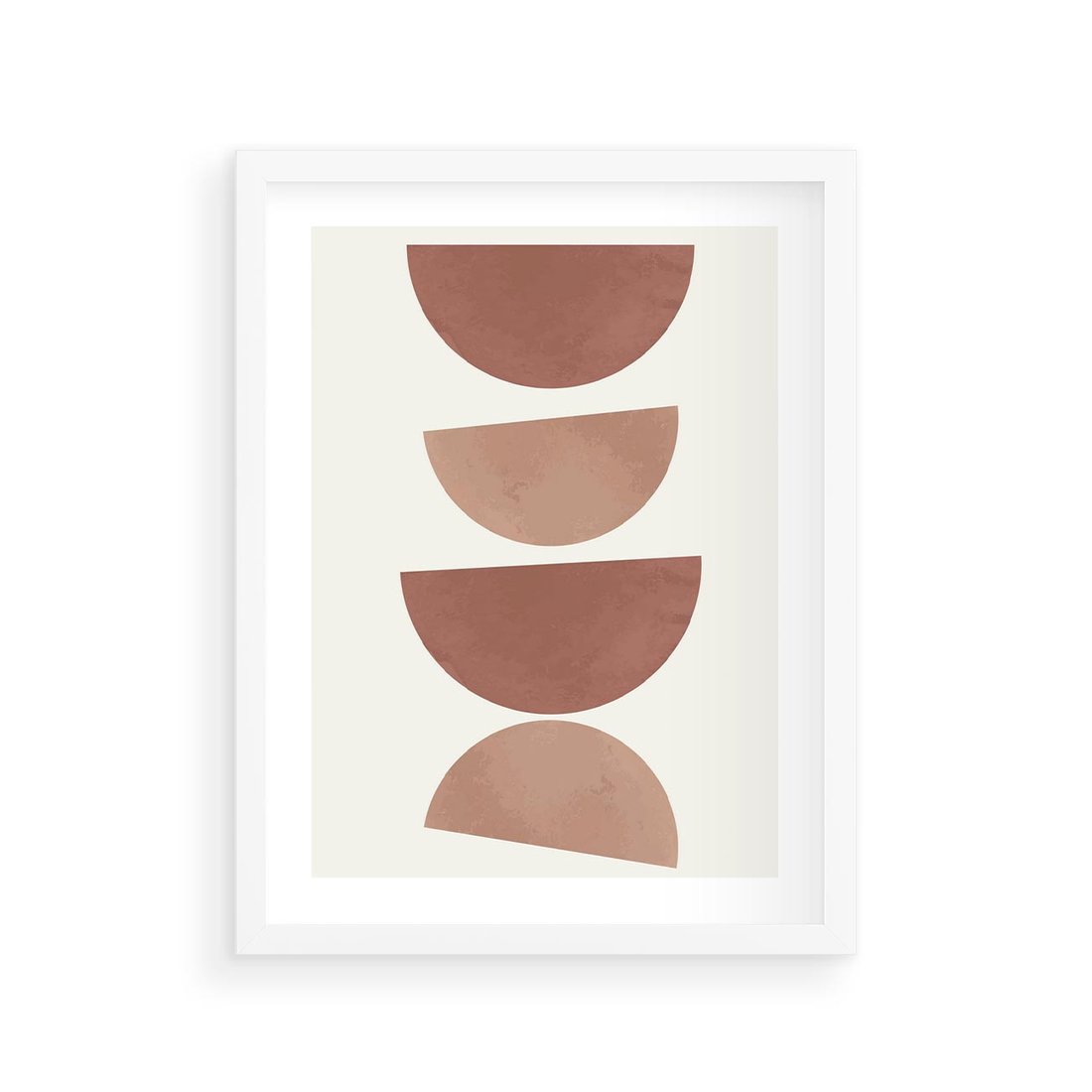Ten obraz przedstawia abstrakcyjne geometryczne kształty w stonowanych odcieniach brązu i beżu. Doskonale wpasuje się w minimalizm, boho styl i nowoczesne wnętrza.