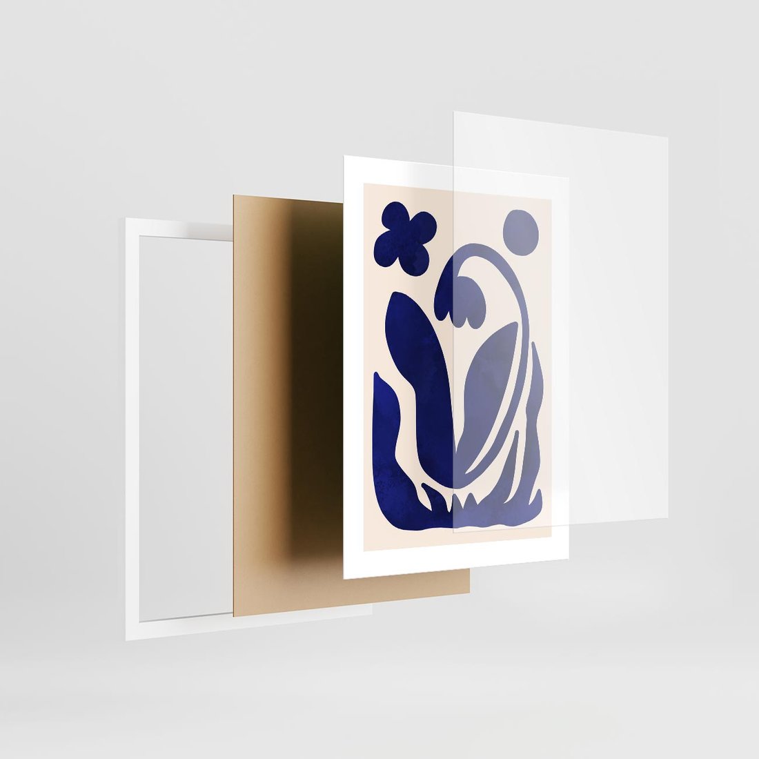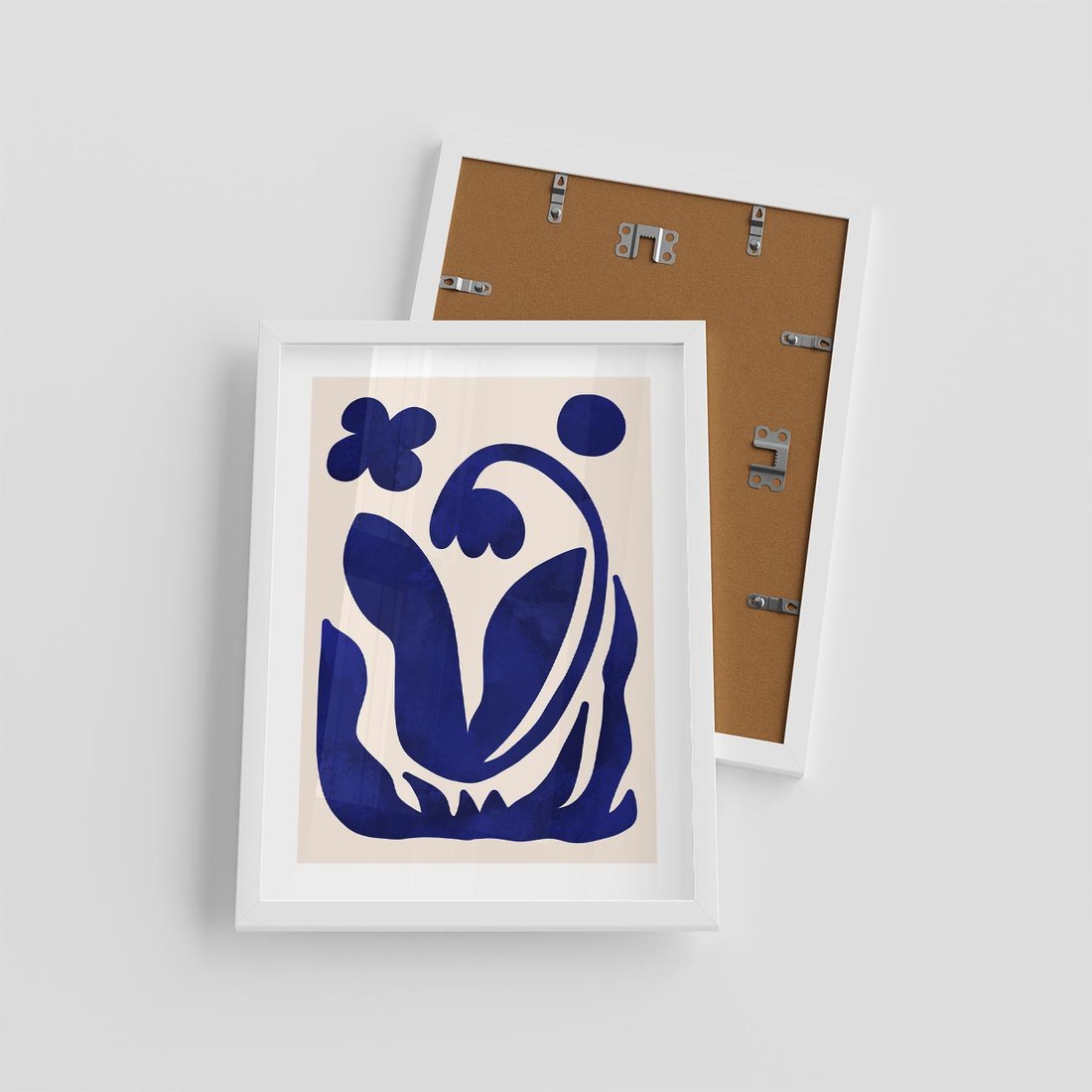 Plakat w ramie 30x40 - Bezgraniczne Echa Serca - abstrakcyjny obraz plakat, dziwne niebieskie kształty przypominają kwiat - rama biała