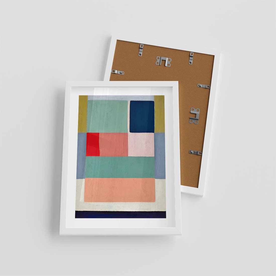 To olejny obraz o abstrakcyjnych geometrycznych kształtach, w których dominują pastelowe kolory. Prostokąty i kwadraty tworzą harmonijną kompozycję, która zachwyca swoją subtelnością i równowagą.