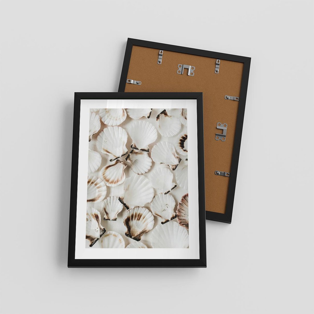 Plakat w ramie 30x40 - Białe Muszle - białe muszle, ujęcie z góry - rama czarna