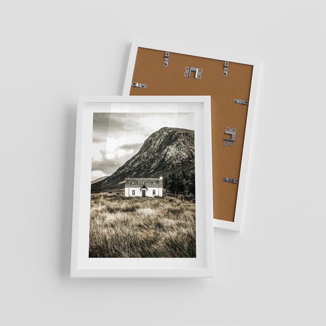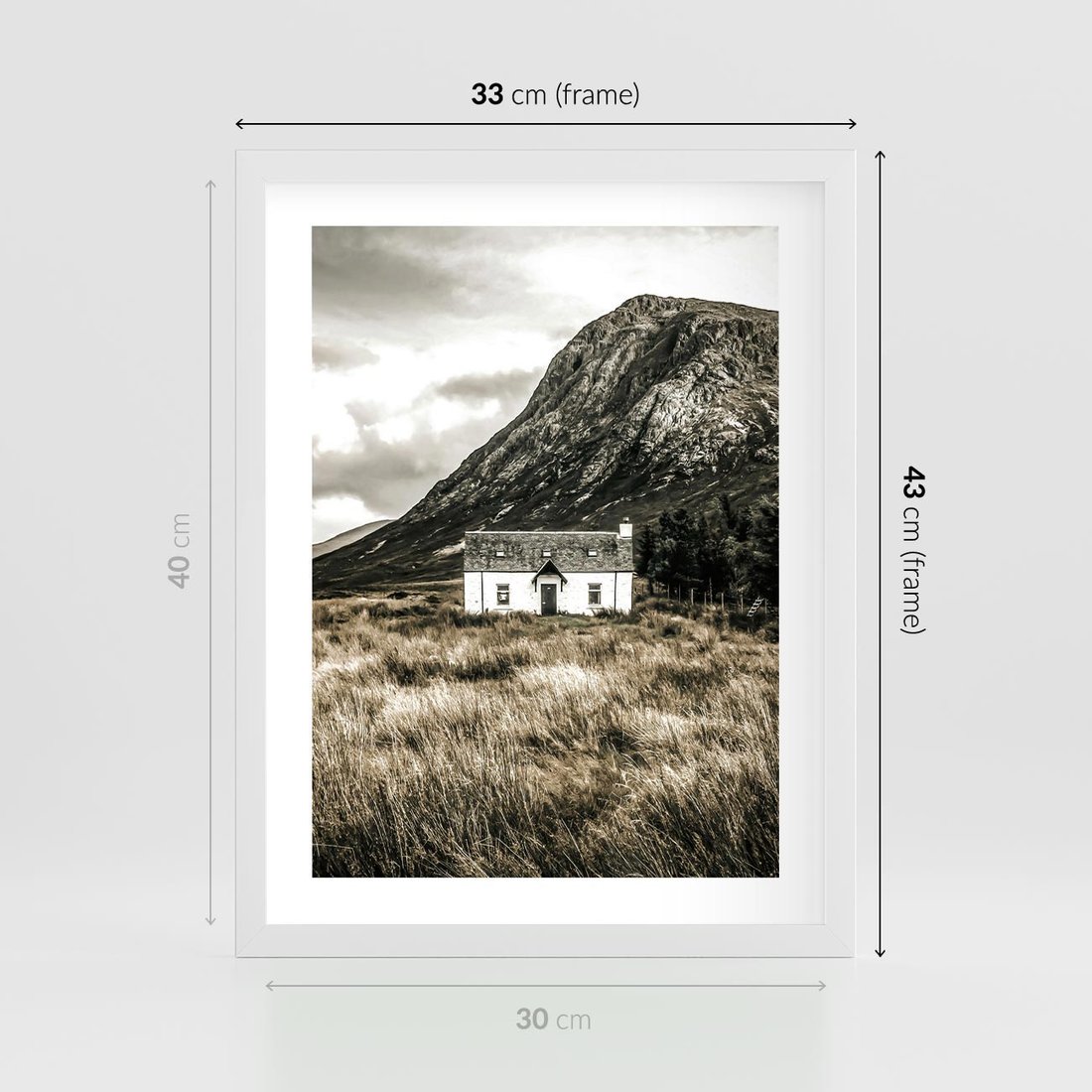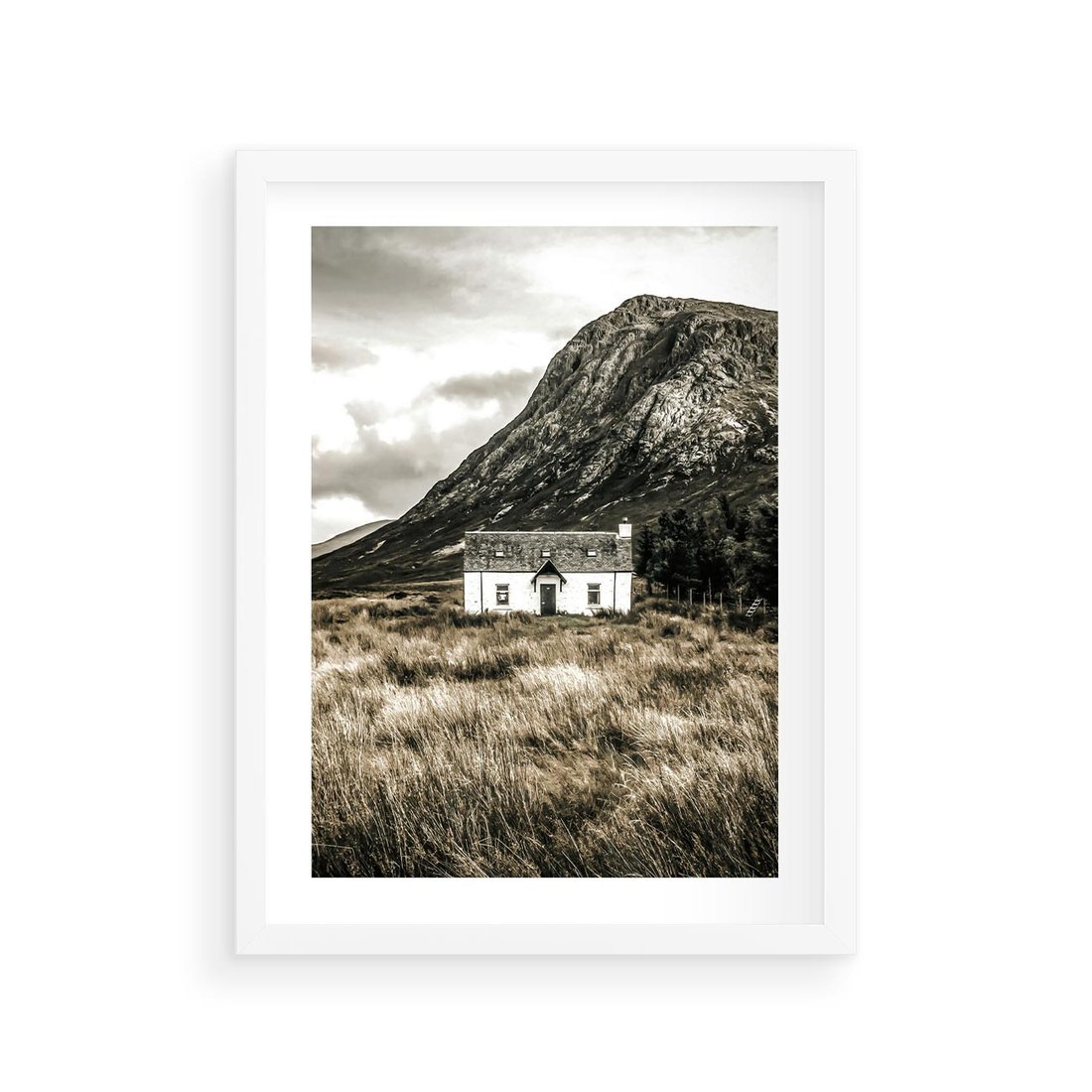 Plakat w ramie 30x40 - Biały Domek w Sepii: Wiejski Urok - domek w górach, kolory sepii - rama biała