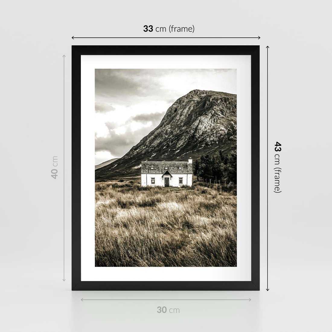 Plakat w ramie 30x40 - Biały Domek w Sepii: Wiejski Urok - domek w górach, kolory sepii - rama czarna