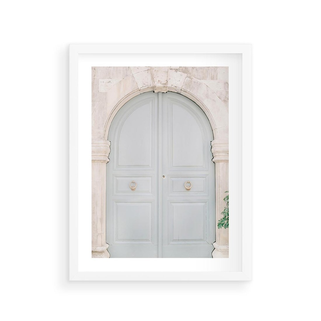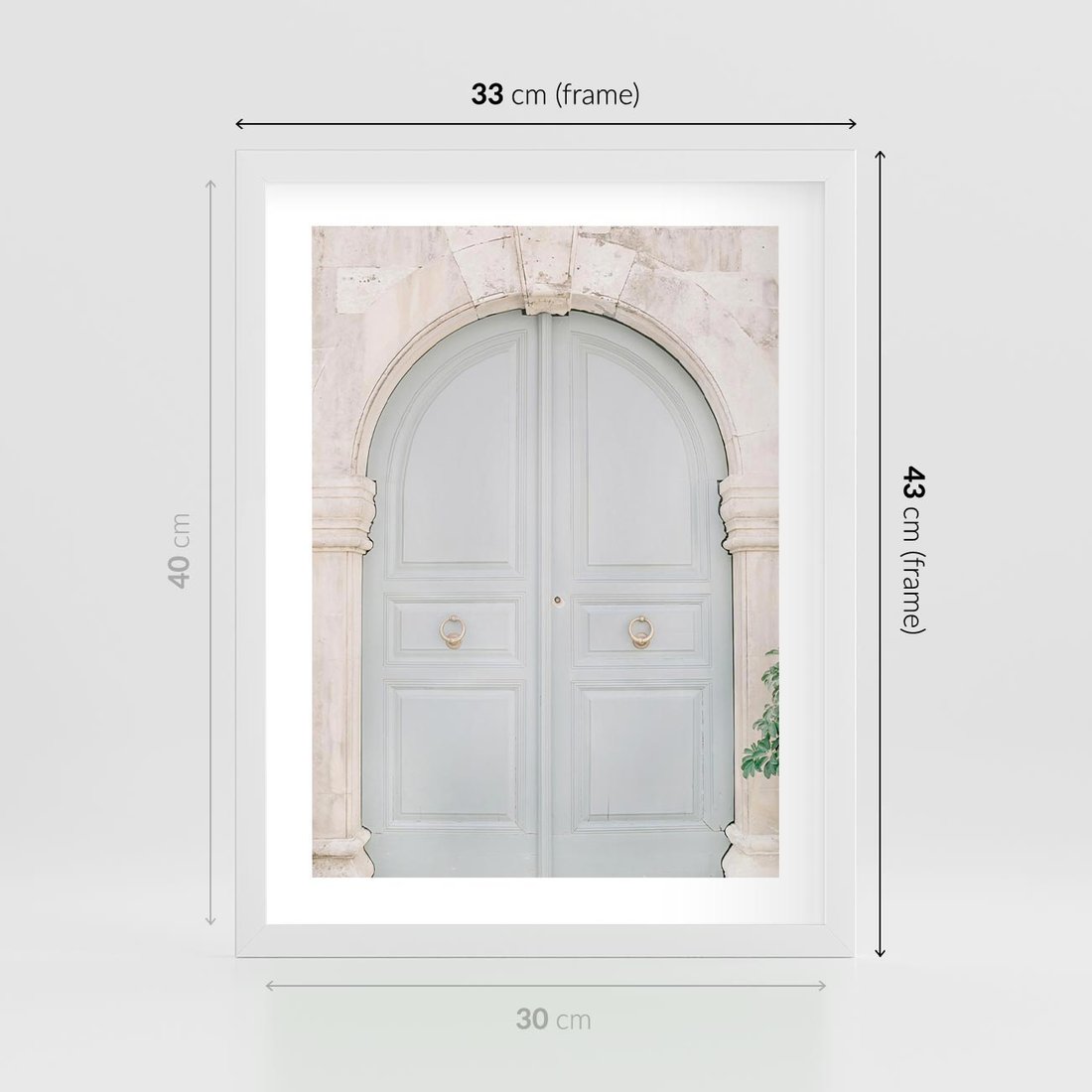 Plakat w ramie 30x40 - Błękitne Drzwi Kamienicy: Urok Historii - stare piękne drzwi do kamienicy, błękitne drzwi - rama biała