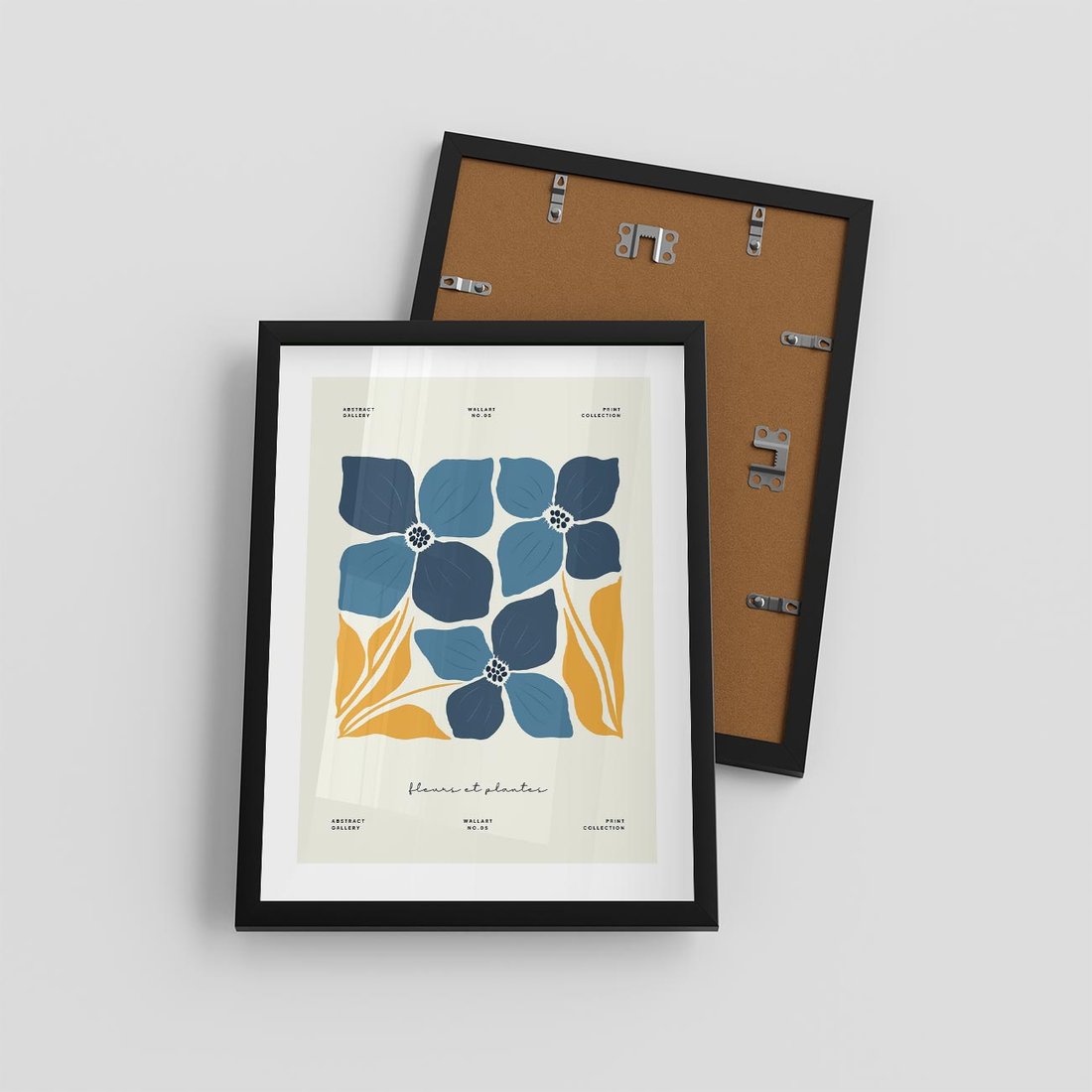 Ta nowoczesna sztuka ukazuje niebieskie kwiaty w nowym świetle, z subtelnie wkomponowaną typografią. Kompozycja tworzy spokojny i elegancki nastrój, zapraszając do odkrywania piękna i spokoju natury.