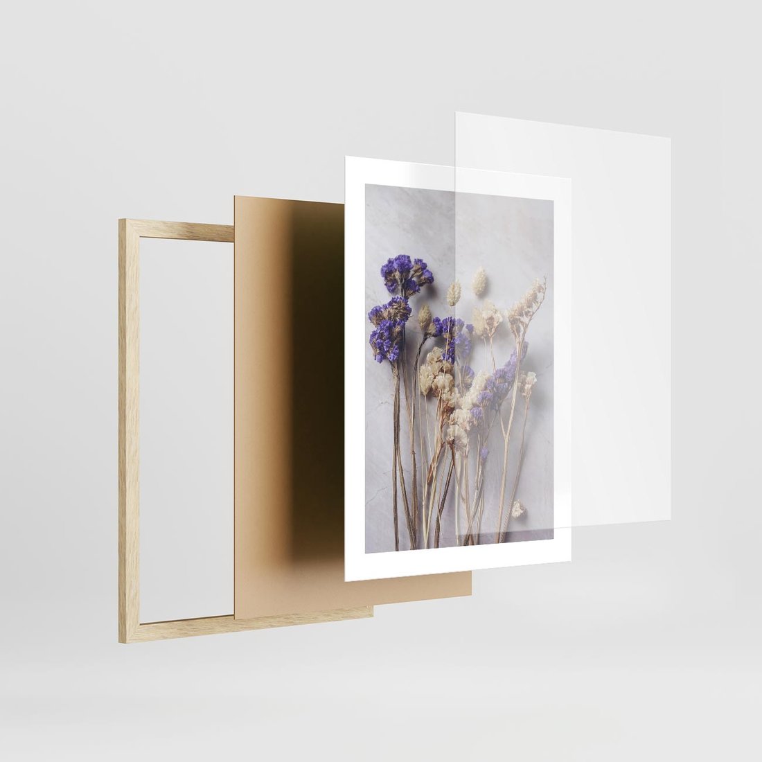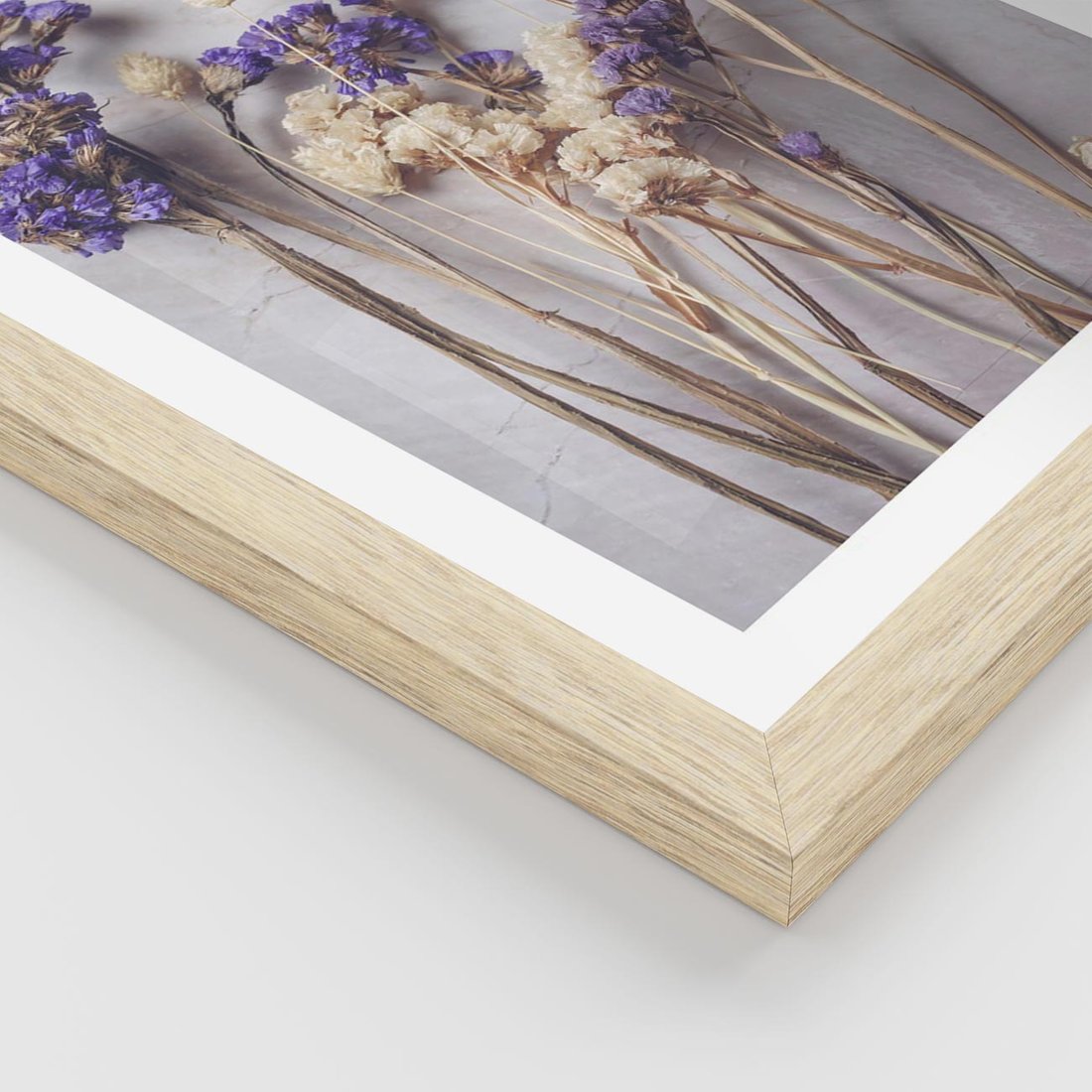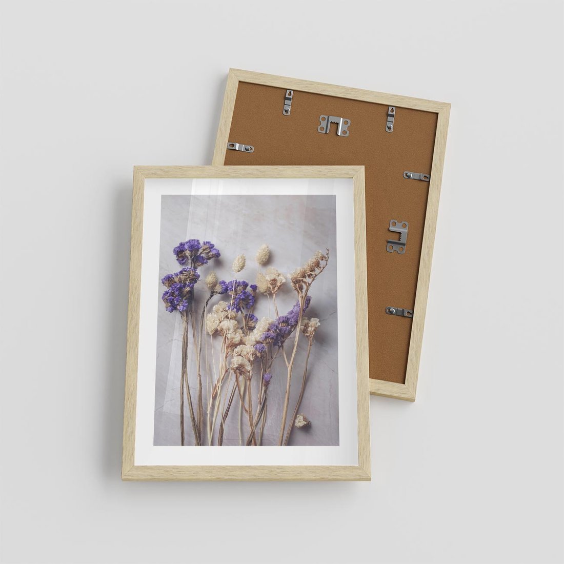 Obraz przedstawia delikatną kompozycję z suszonymi błękitnymi i białymi kwiatami. Ta artystyczna kompozycja idealnie pasuje do wnętrz o romantycznym lub minimalistycznym charakterze, dodając subtelny i elegancki akcent.