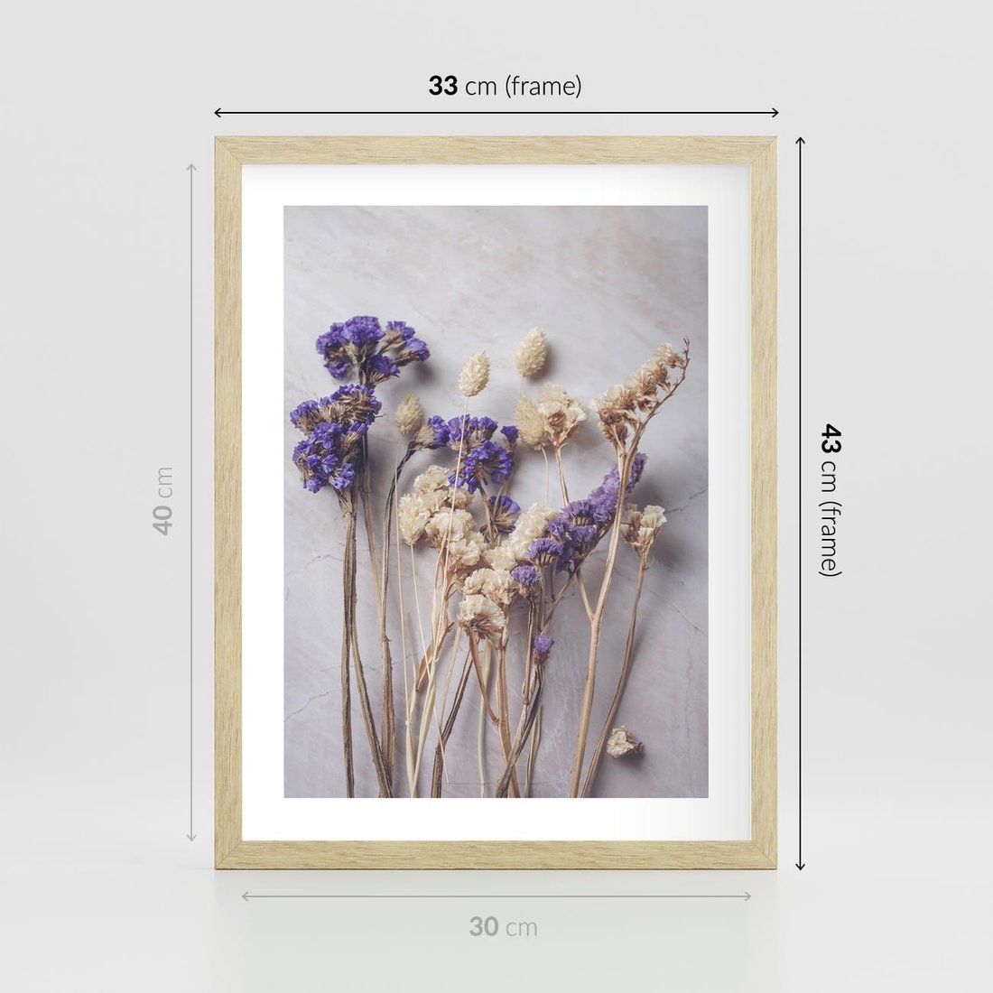 Plakat w ramie 30x40 - Błękitno-Biała Harmonia - suszone kwiaty, błekitne - rama drewno