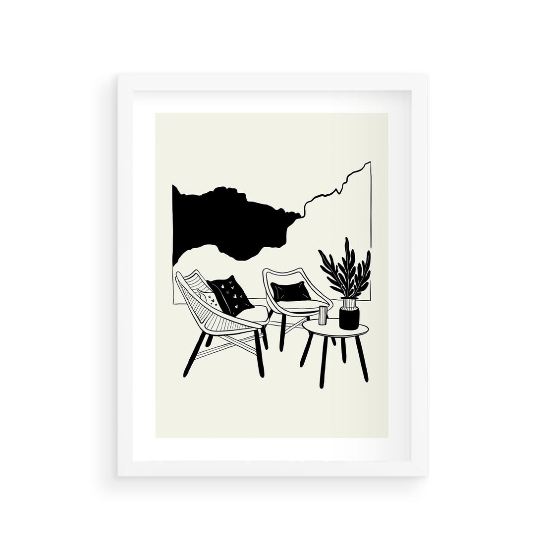 Ten biało-czarny rysunek doskonale wpisuje się w boho wnętrze salonu, łącząc nowoczesną sztukę z duchem swobodnego stylu. Kreuje on harmonijną atmosferę, dodając salonowi wyjątkowy urok.