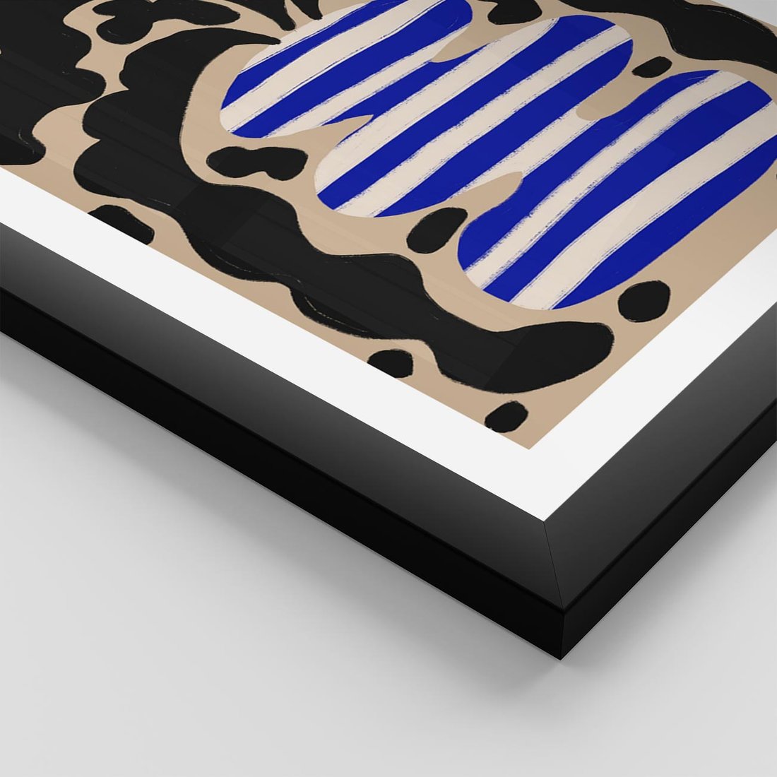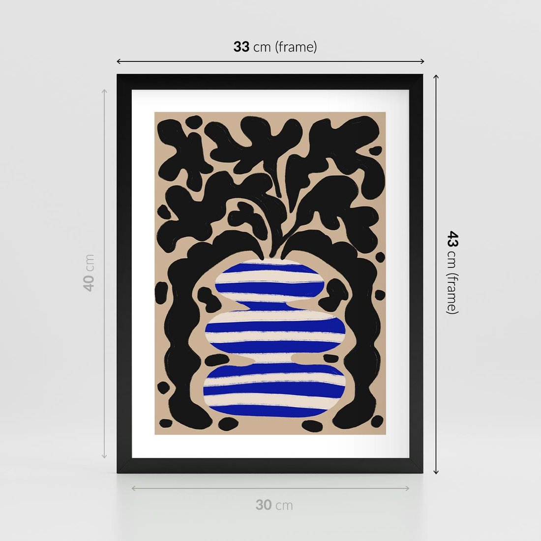 Ten abstrakcyjny plakat prezentuje fascynujące formy, które mogą przypominać wazon w biało-niebieskie pasy, a w nim umieszczone są stylizowane, czarne liście. To wyjątkowy dodatek do każdego wnętrza.