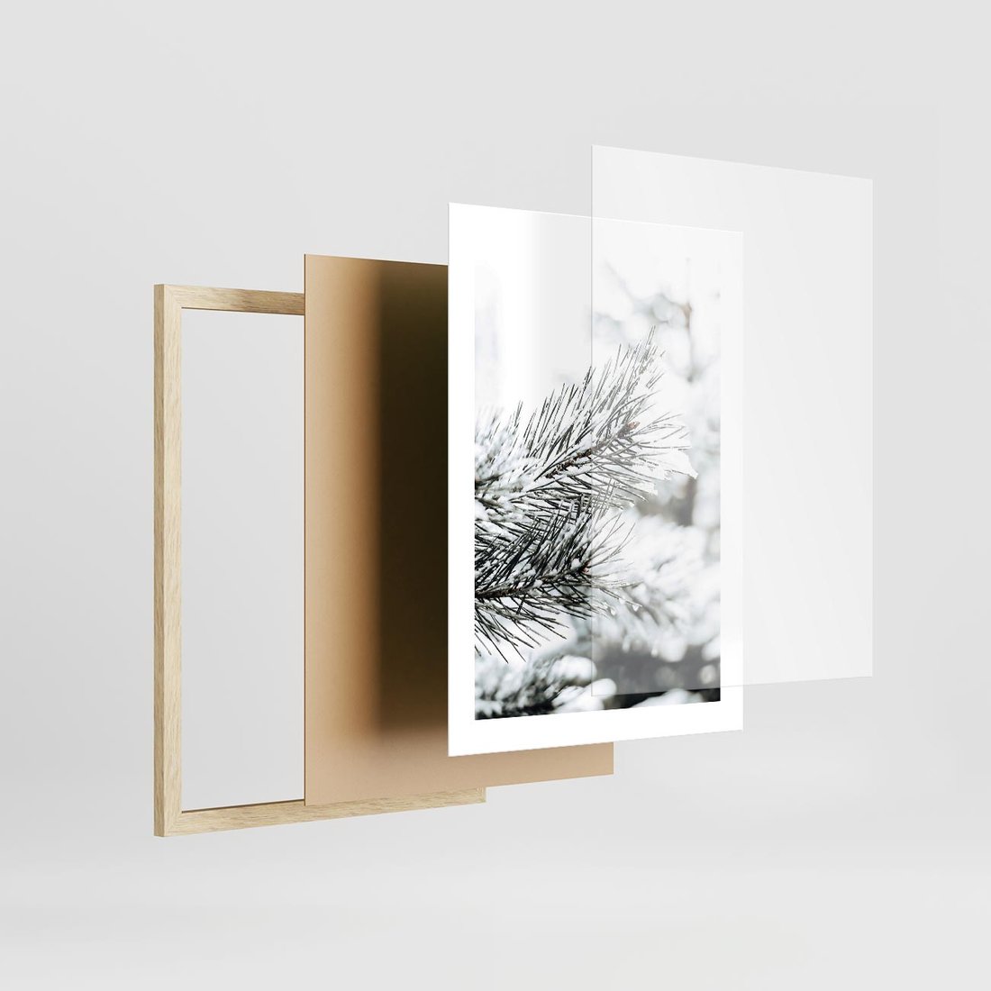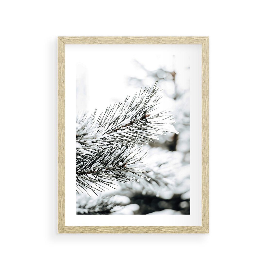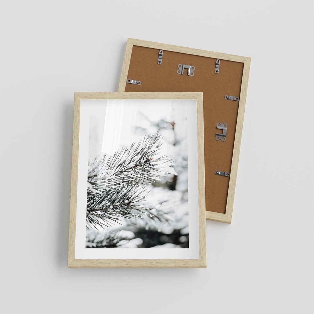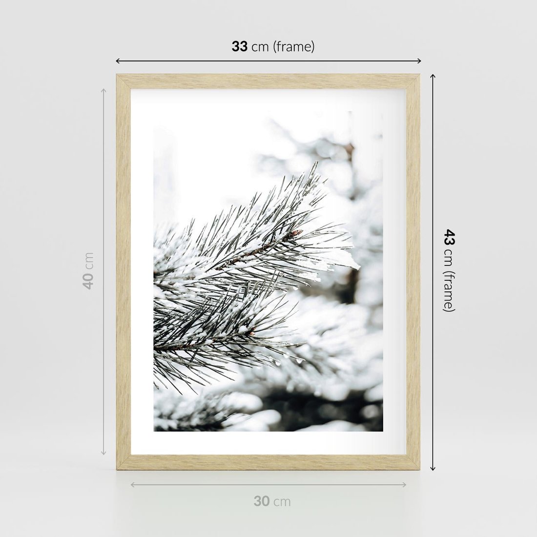 Plakat w ramie 30x40 - Chwila Zimowej Magii - iglasta gałązka, śnieg - rama drewno