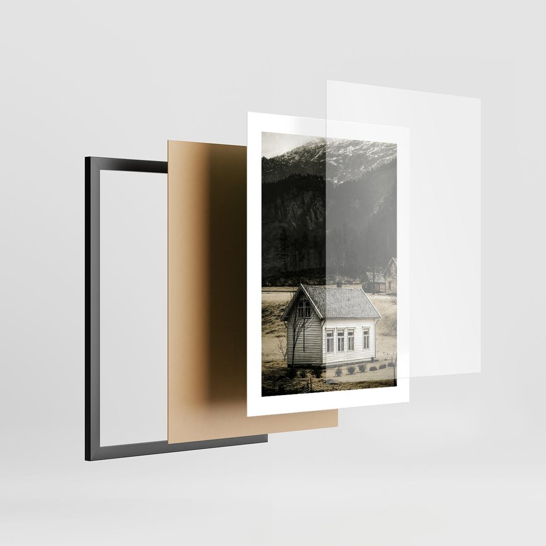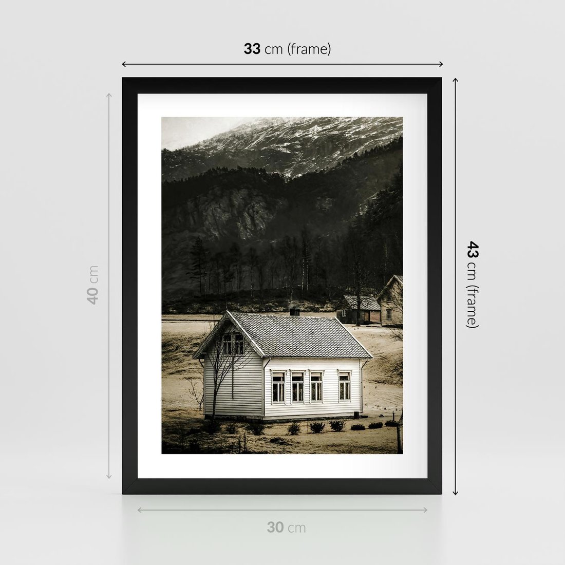 Plakat w ramie 30x40 - Ciepło i Urok Górskiego Domku - domek w górach, sepia - rama czarna
