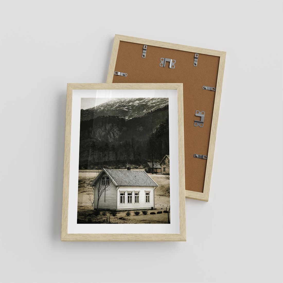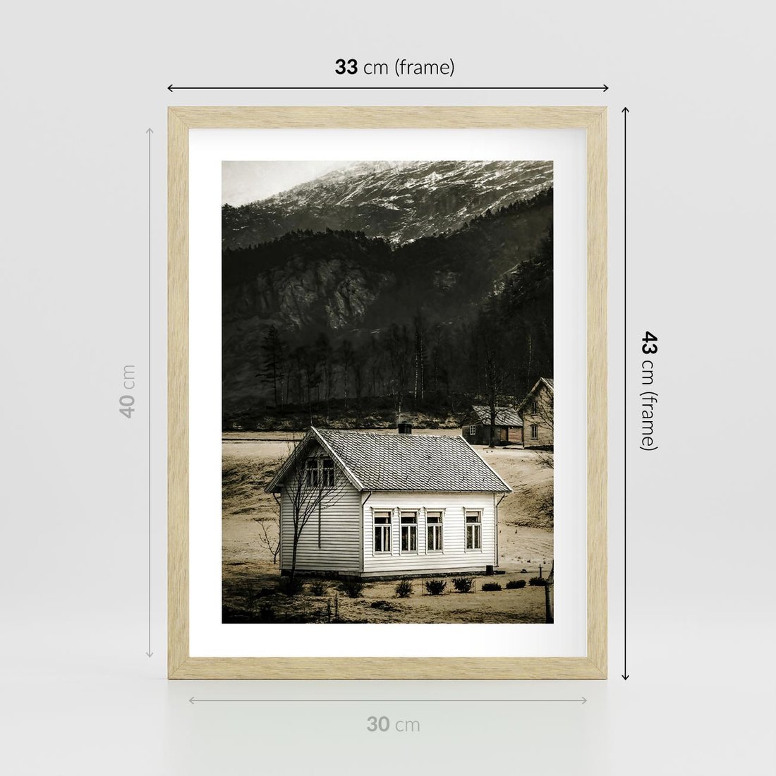 Plakat w ramie 30x40 - Ciepło i Urok Górskiego Domku - domek w górach, sepia - rama drewno