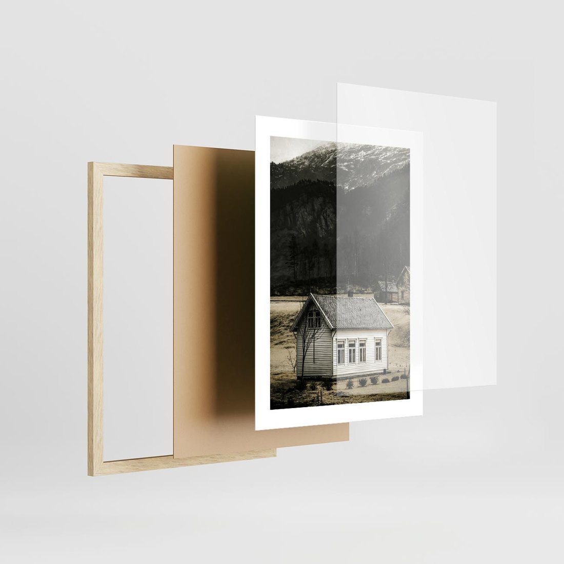 Obraz przedstawia domek w górach utrzymany w odcieniach sepii. Ta kompozycja nadaje wnętrzom klasyczną i nostalgiczna atmosferę.