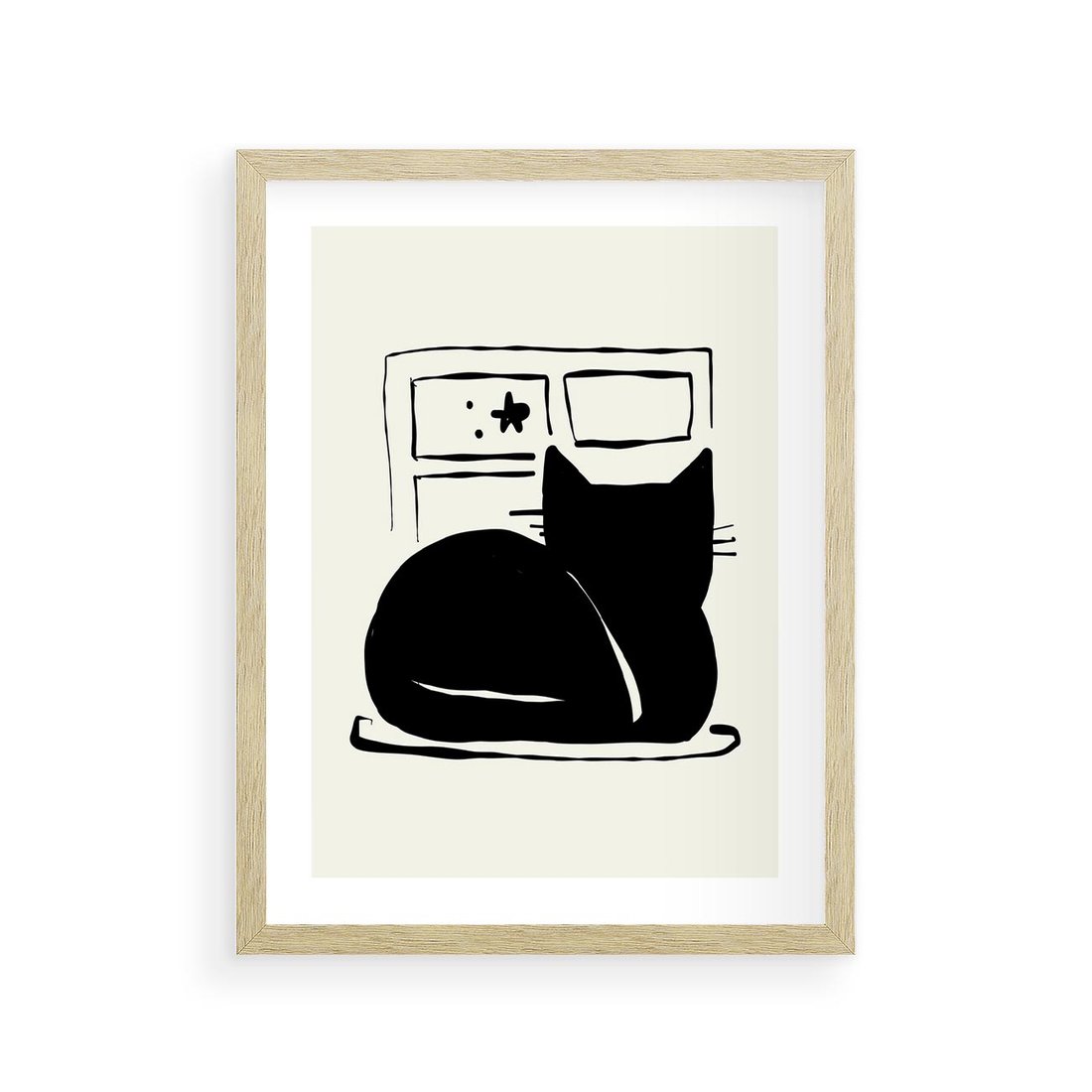 Plakat w ramie 30x40 - Czarny Kot: Prosta Elegancja - grafika, minimalizm - rama drewno
