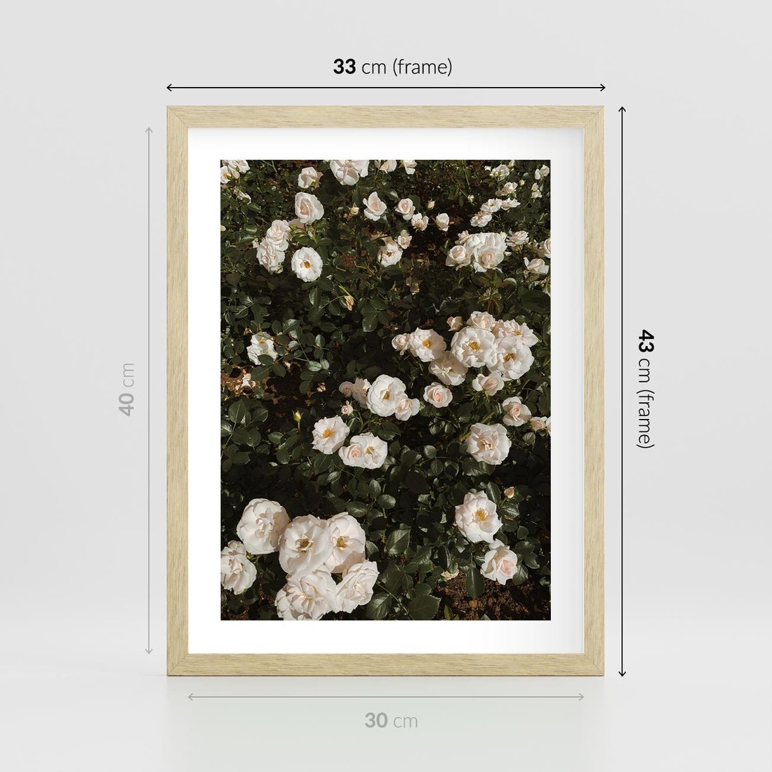 Plakat w ramie 30x40 - Czyste Piękno - białe kwiaty, białe róże - rama drewno