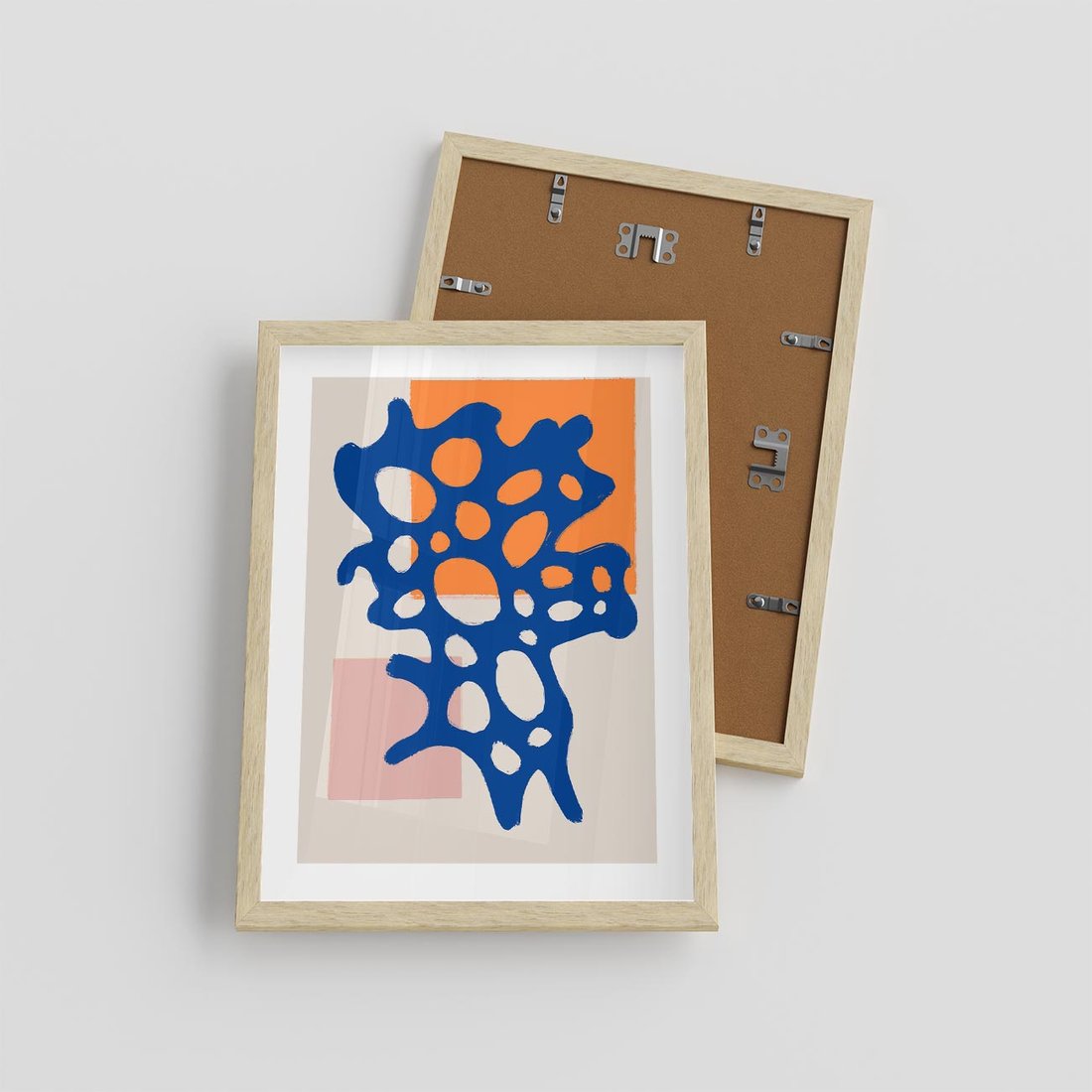 Ten nowoczesny plakat to zbiór abstrakcyjnych geometrycznych kształtów w intensywnych odcieniach pomarańczu i granatu. To dzieło sztuki wnosi do Twojej przestrzeni energię i nowoczesność, jednocześnie pozostając wiernym abstrakcyjnym korzeniom. Idealny wybór dla tych, którzy cenią sobie wyraziste wzory i nowoczesny design.
