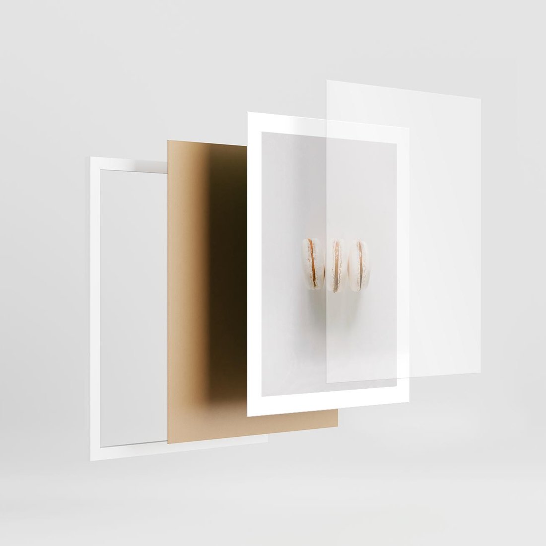 To minimalistyczne zdjęcie białych ciasteczek typu makaroników, które prezentuje ich delikatność i estetykę w prostym i czystym stylu.