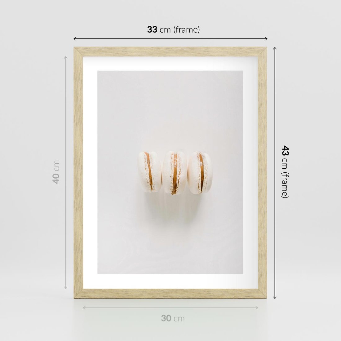 Plakat w ramie 30x40 - Delikatność w Bieli - białe ciateczka. makaroniki, minimalistyczne zdjęcie - rama drewno