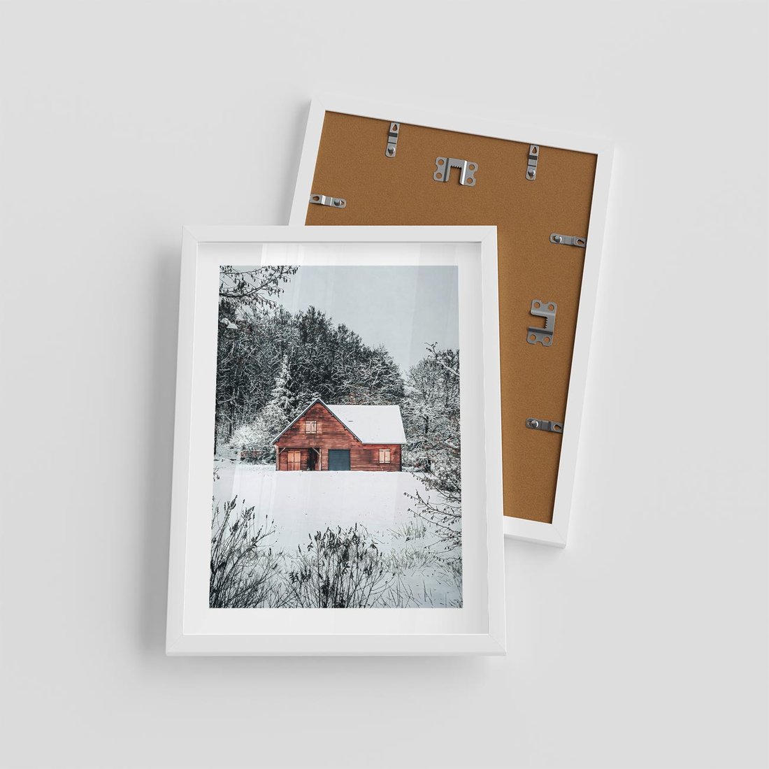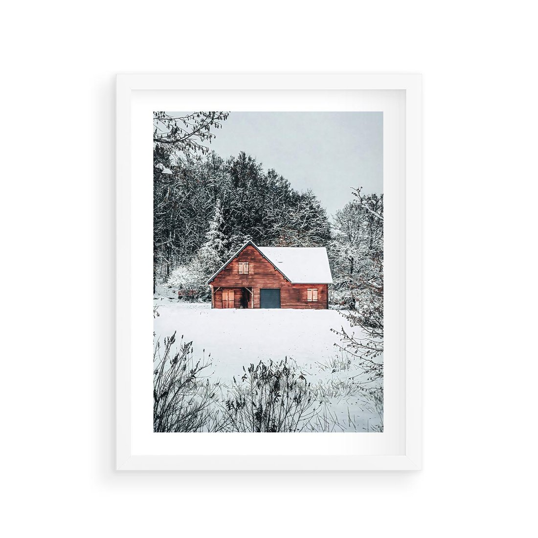 Plakat w ramie 30x40 - Domek w Górach Pokryty Śniegiem - domek w górach, śnieg - rama biała