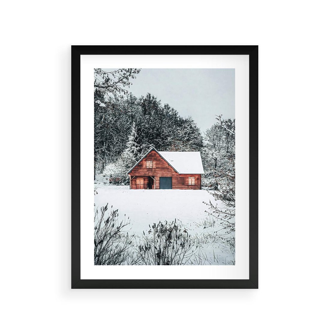 Plakat w ramie 30x40 - Domek w Górach Pokryty Śniegiem - domek w górach, śnieg - rama czarna