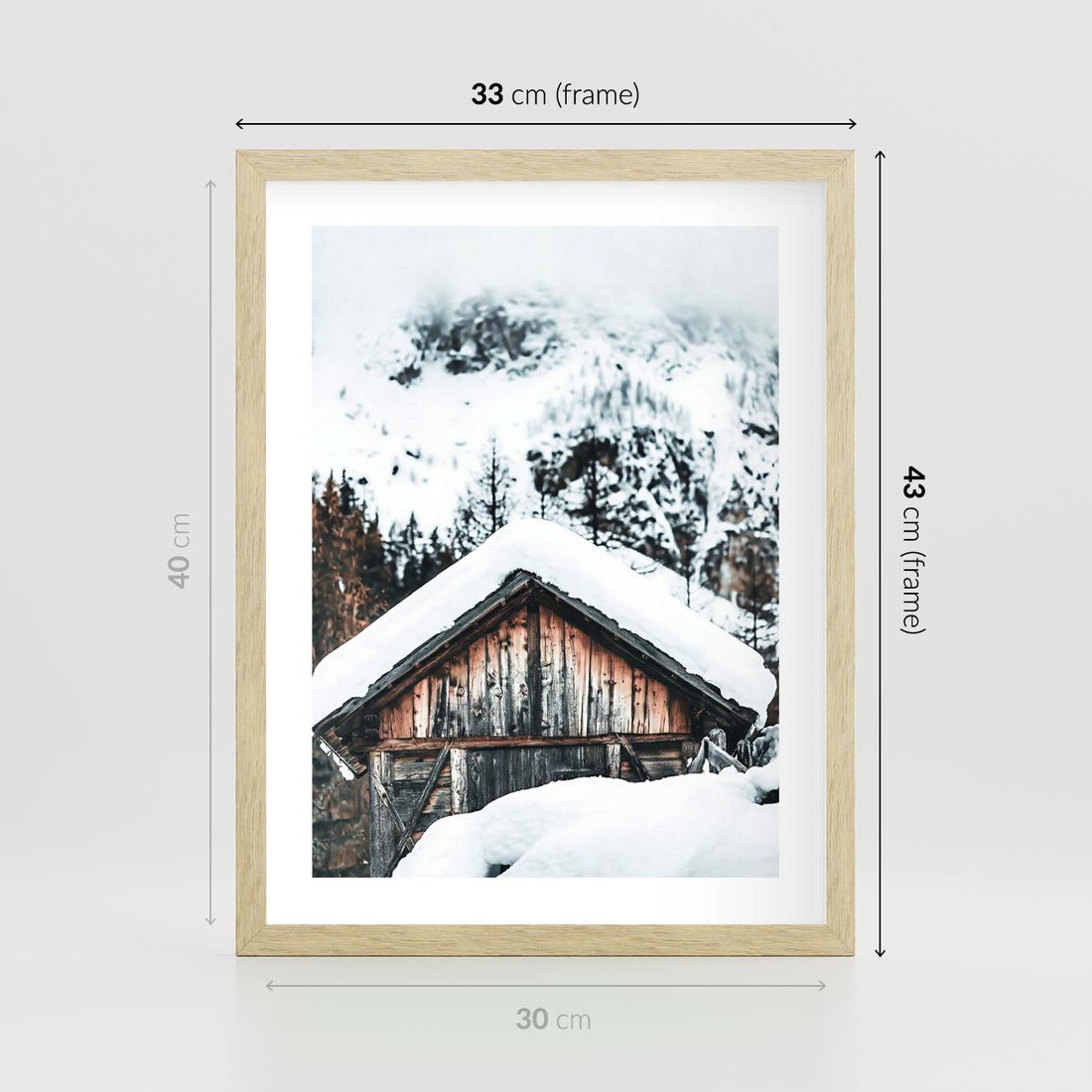 Plakat w ramie 30x40 - Domek w Górach w Białym Odcieniu - zima, domek w górach - rama drewno
