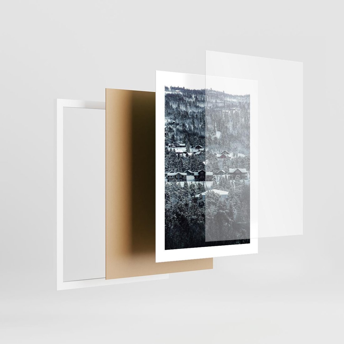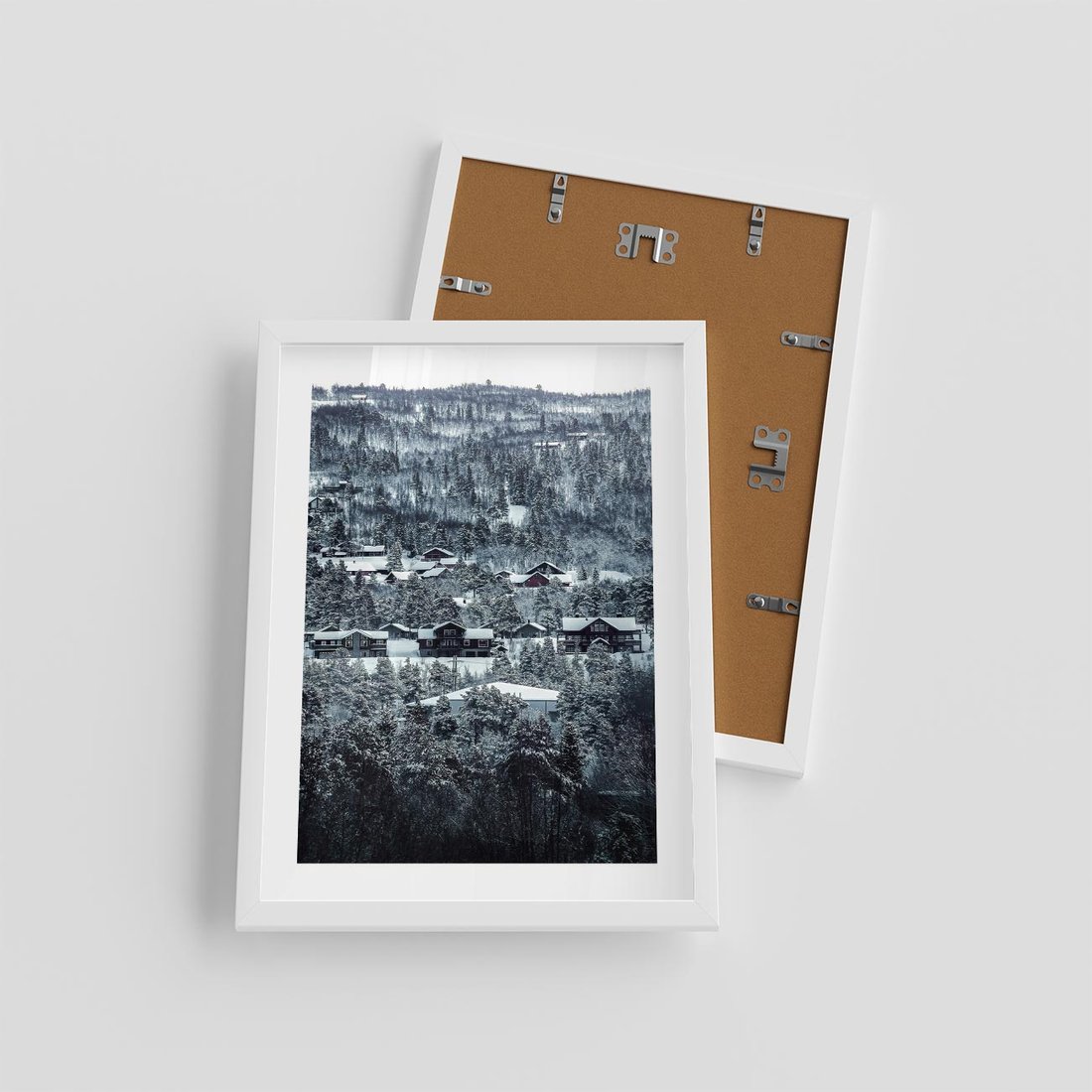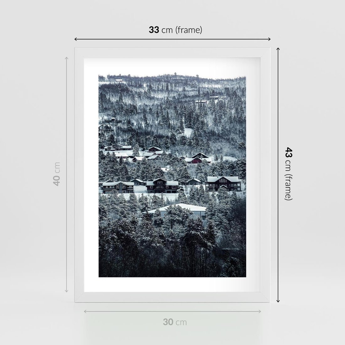 Plakat w ramie 30x40 - Domki w Chmurach - górski zimowy krajobraz, dommki na wzgórzach - rama biała