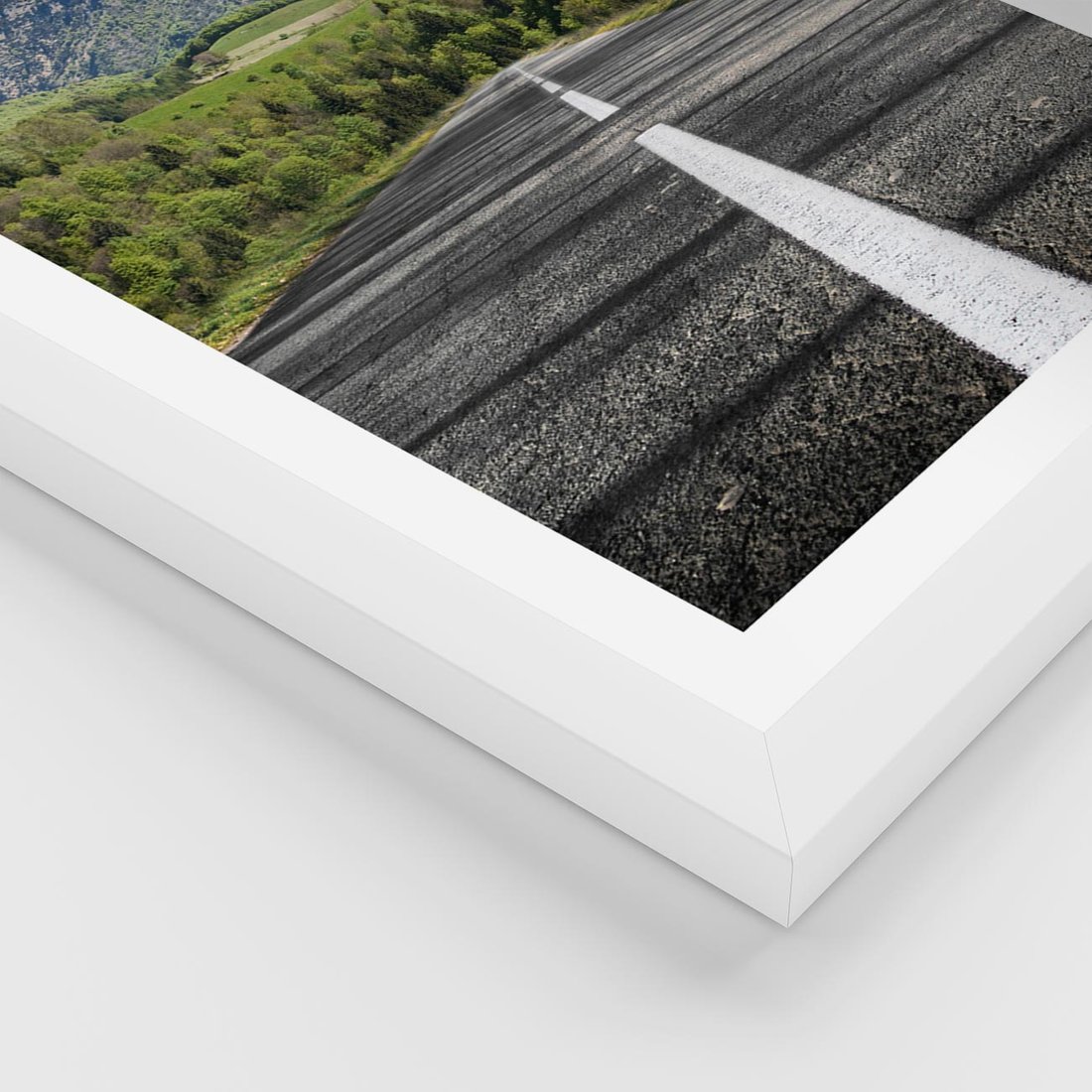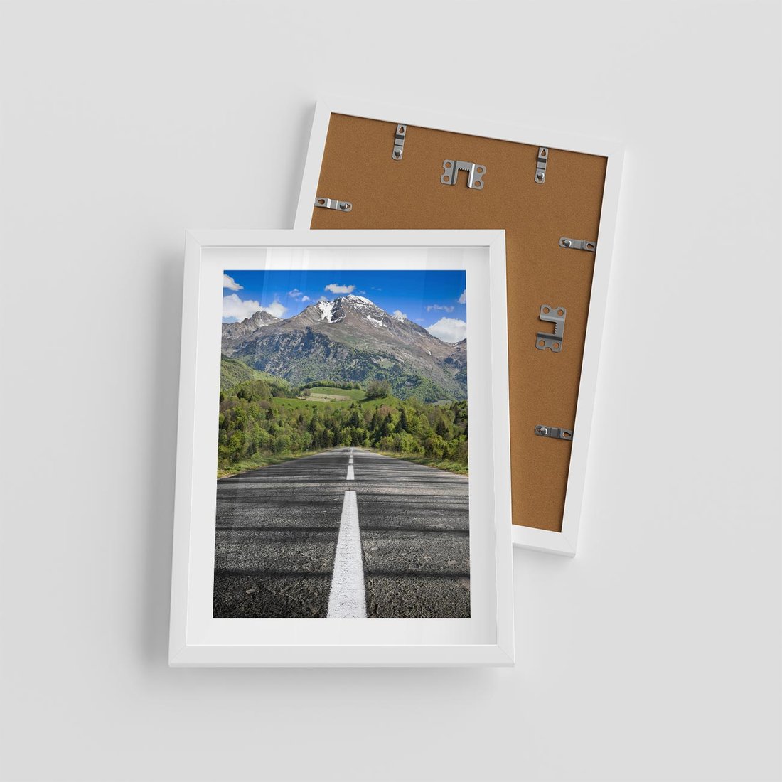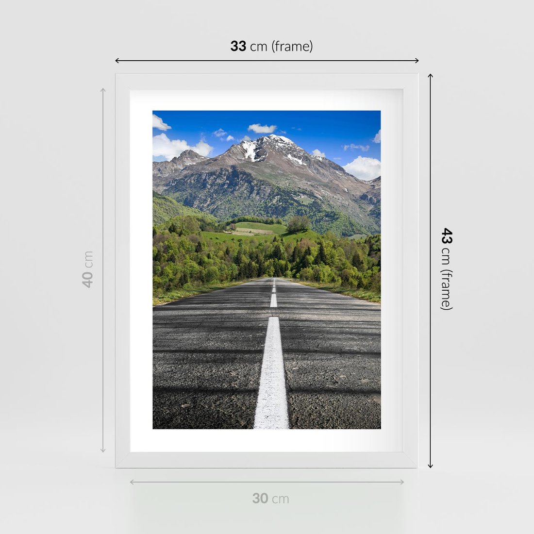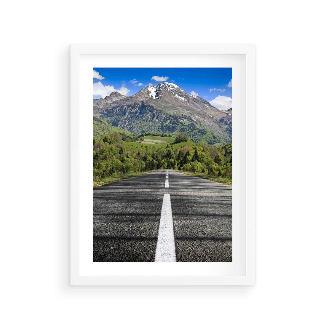 Plakat w ramie 30x40 - Droga przez góry: podróż do przygody - droga, góry - rama biała
