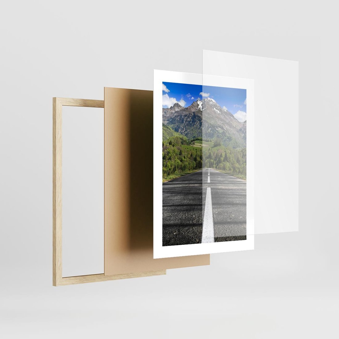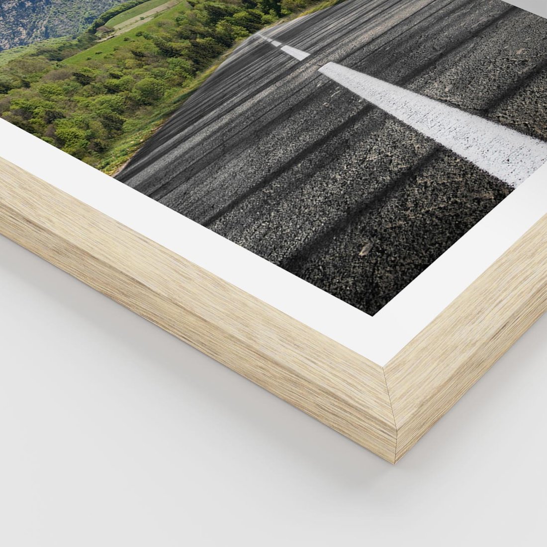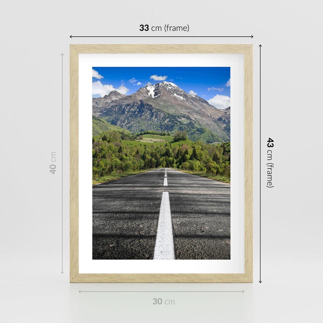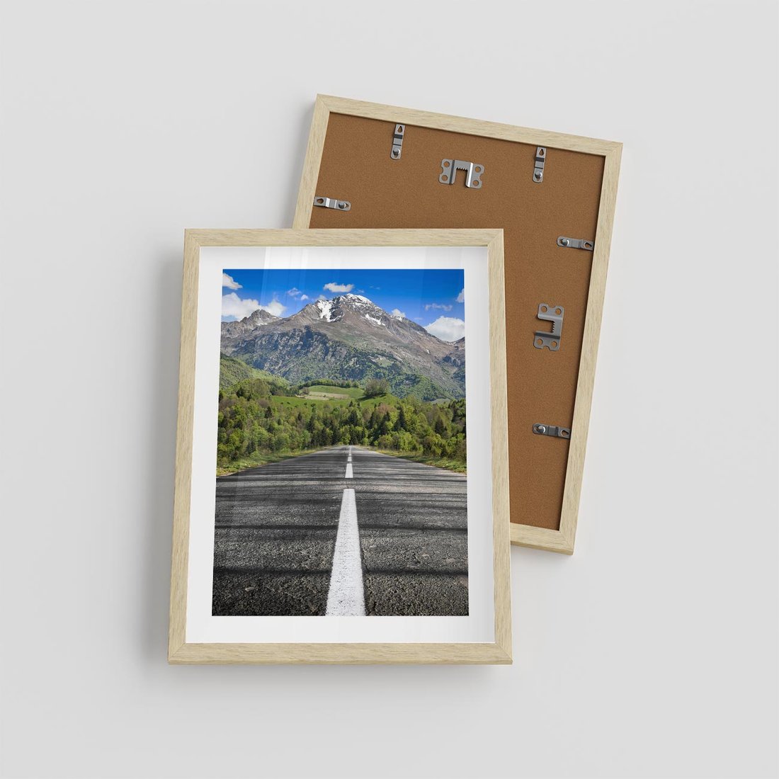 Plakat w ramie 30x40 - Droga przez góry: podróż do przygody - droga, góry - rama drewno