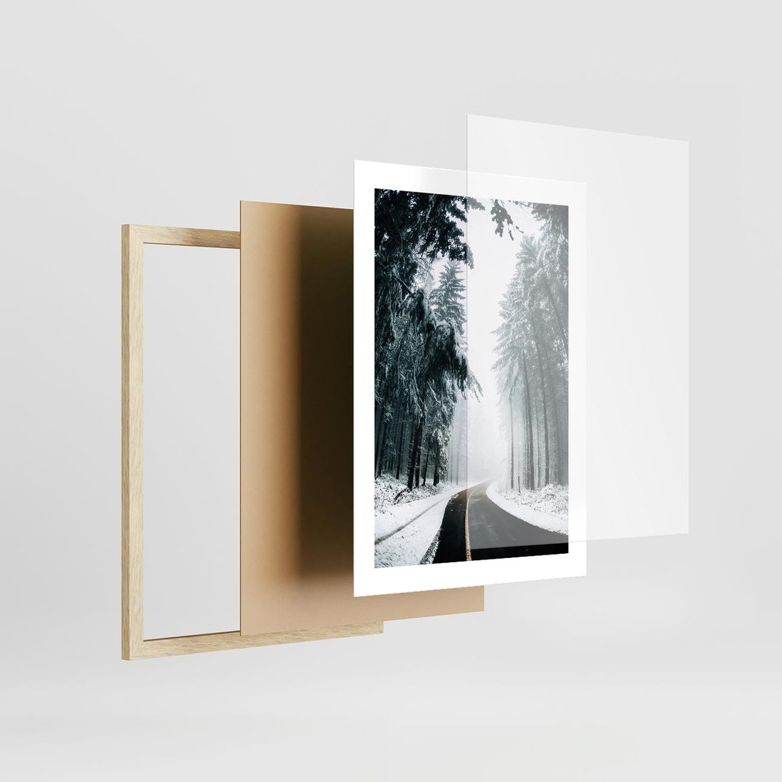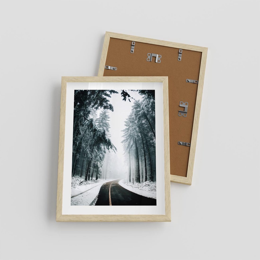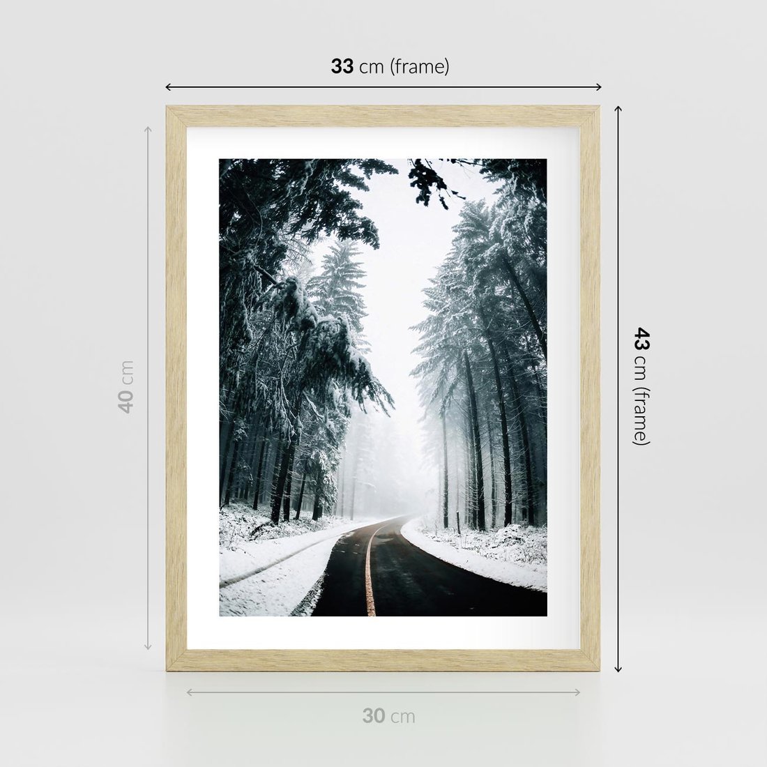 Plakat w ramie 30x40 - Droga przez Zimowy Las - drzewa, śnieg - rama drewno