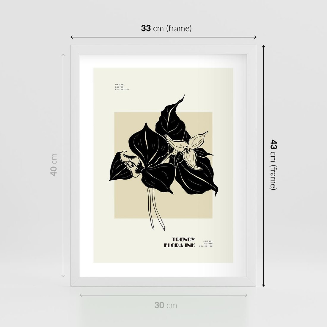 Elegancki minimalizm w połączeniu z kwiatową typografią. Monochromatyczne kolory i czarny kontur tworzą harmonijną kompozycję. Ten obraz przynosi do wnętrza subtelny akcent natury i estetycznej prostoty.