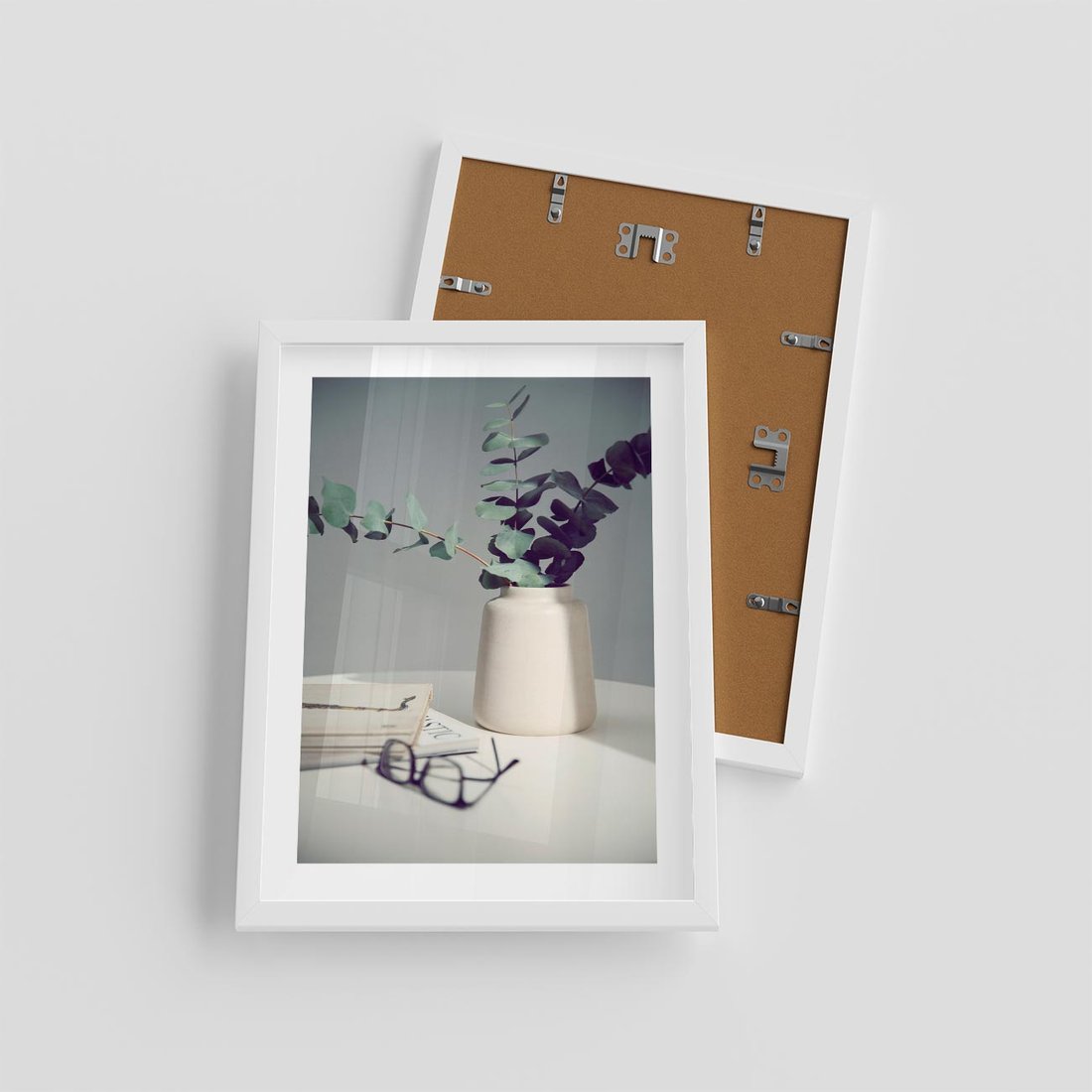 Plakat w ramie 30x40 - Eukaliptusowa Cisza - kompozycja, liście eukaliptusa w wazonie - rama biała