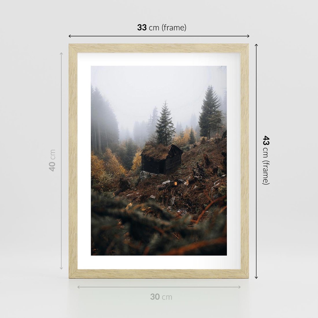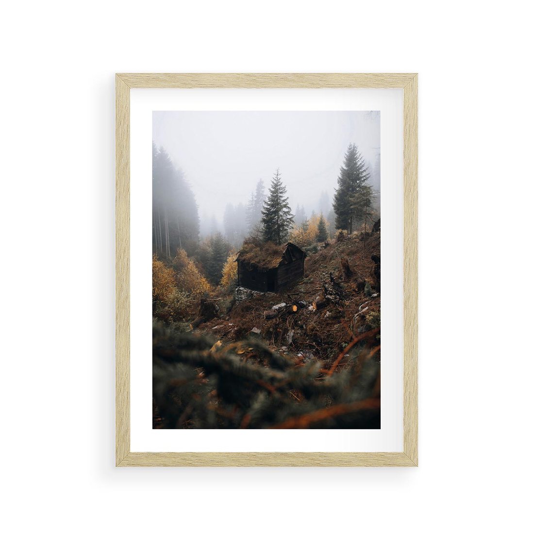Plakat w ramie 30x40 - Górski las - stary zniszczony domek w górach, góry - rama drewno