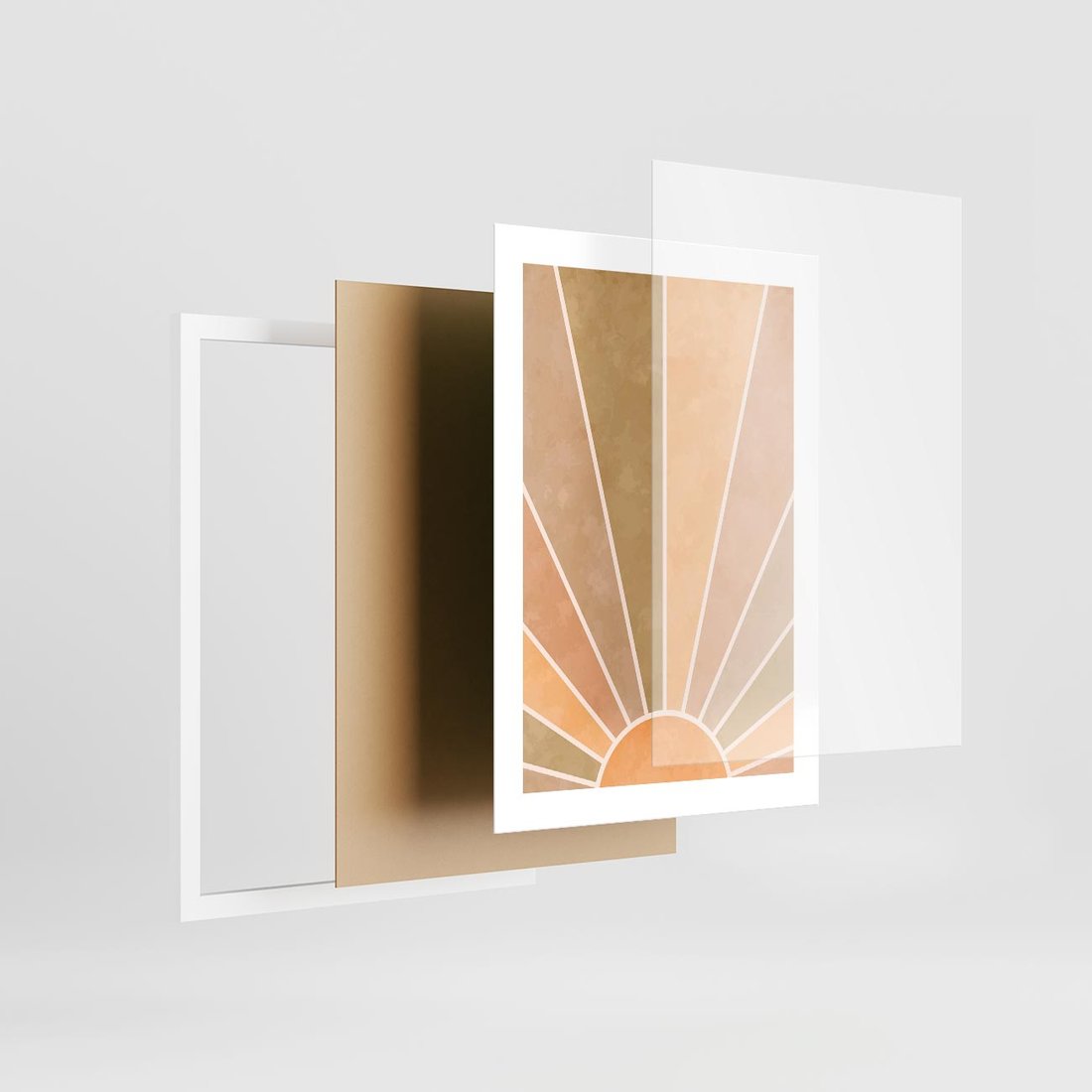 Obraz przedstawia grafikę boho stylu z motywem słońca w odcieniach pomarańczowego koloru. Ta kompozycja artystyczna doskonale podkreśla charakterystyczny styl boho i nadaje wnętrzom przytulnego i egzotycznego klimatu.