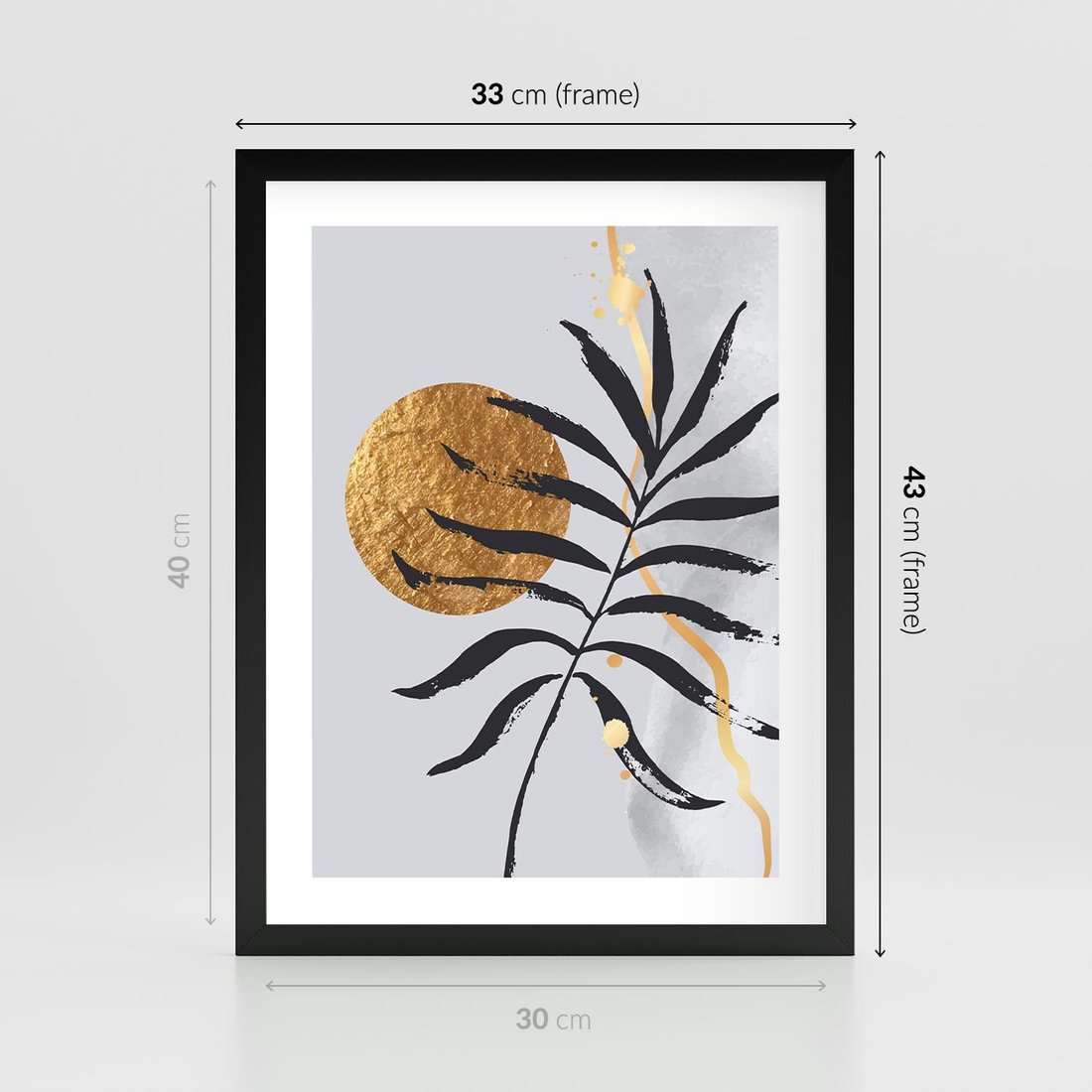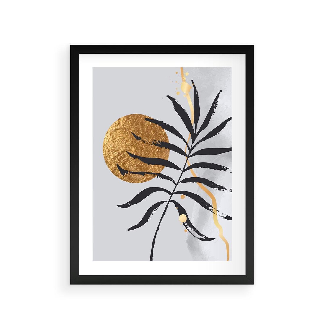 Plakat w ramie 30x40 - Grafika z Czarnym Liściem Palmy - czarny liść palmy, złóte kołó - rama czarna