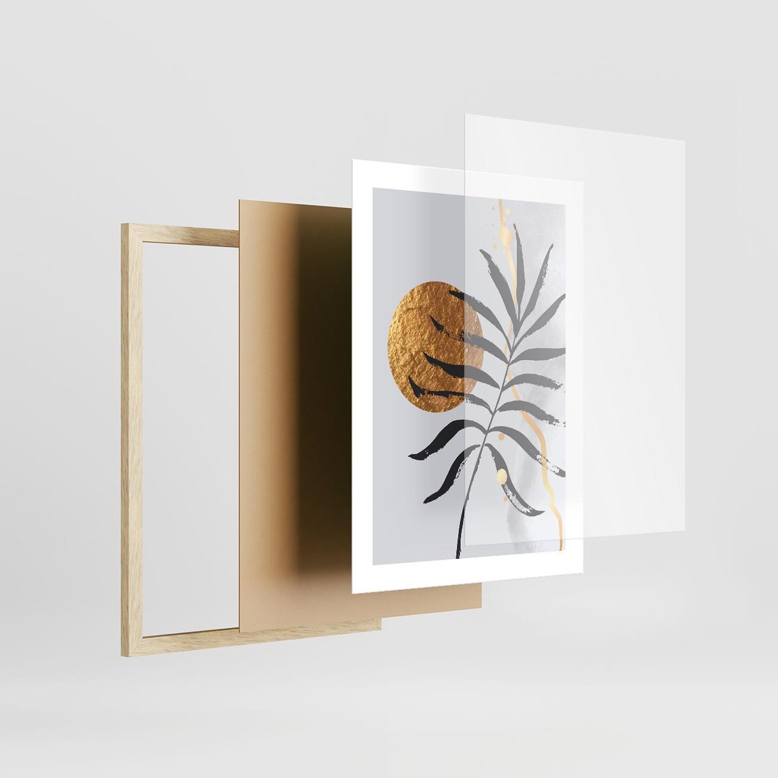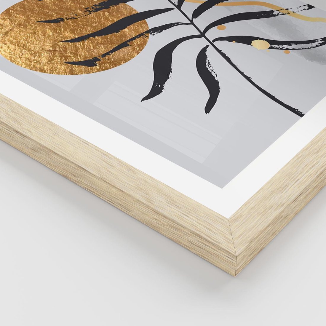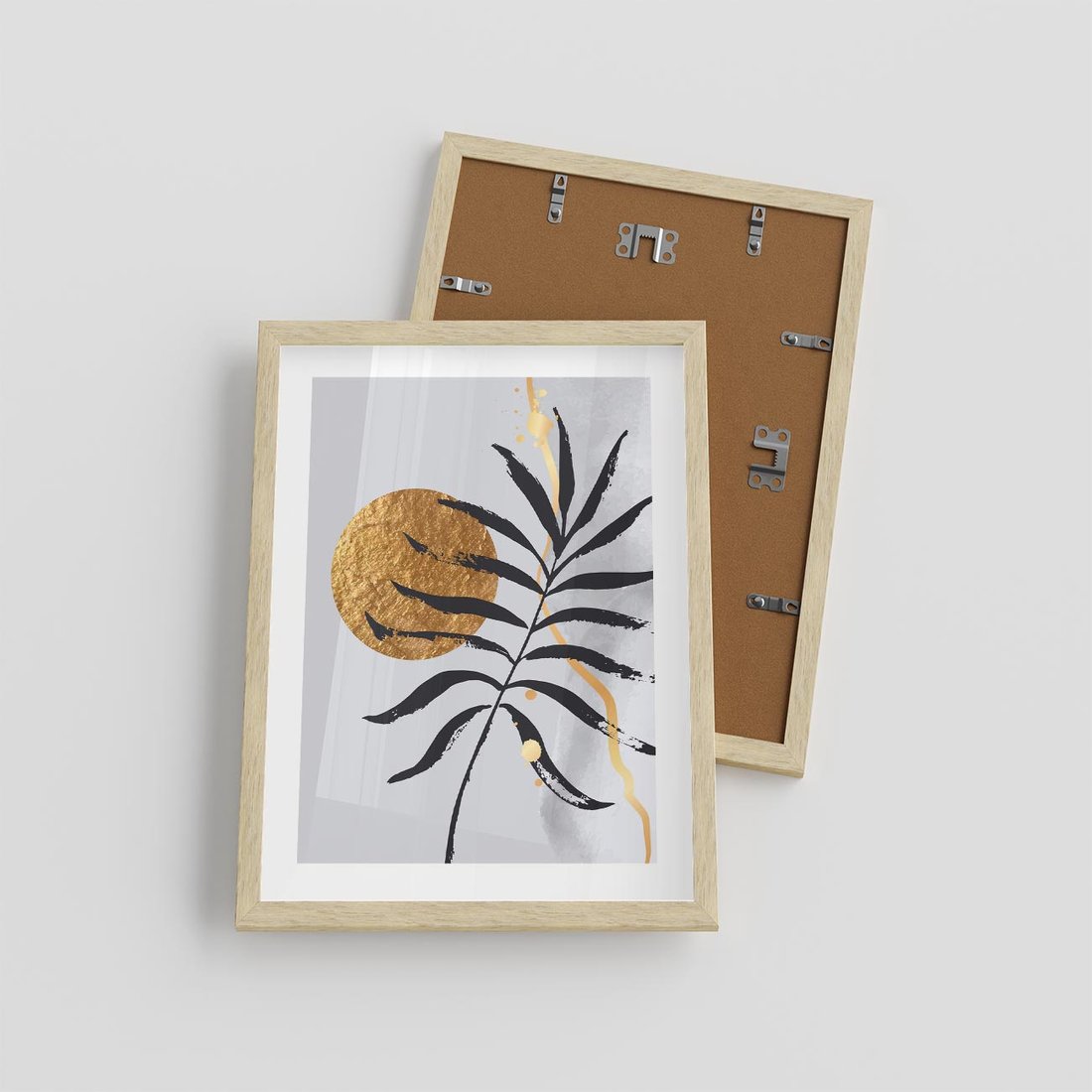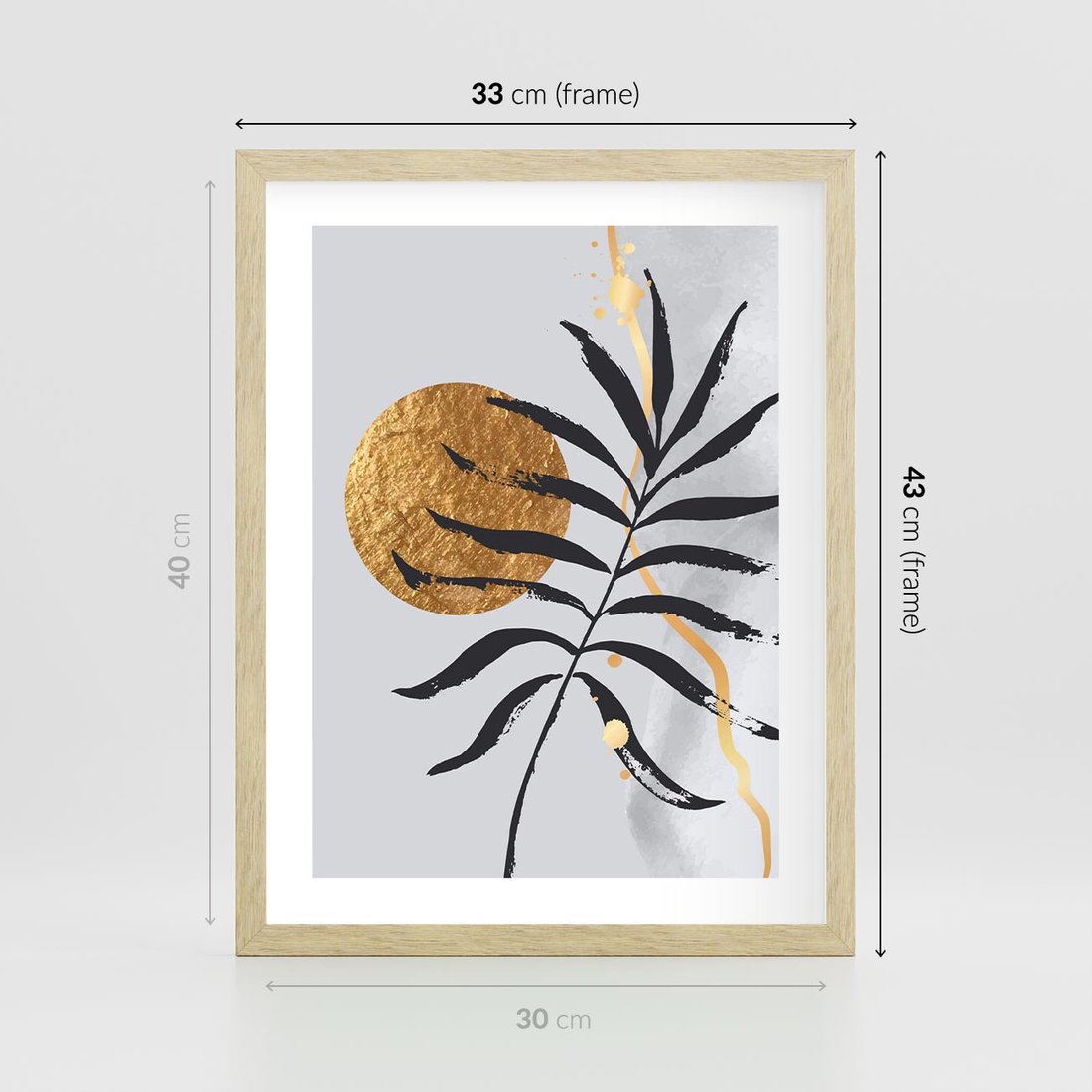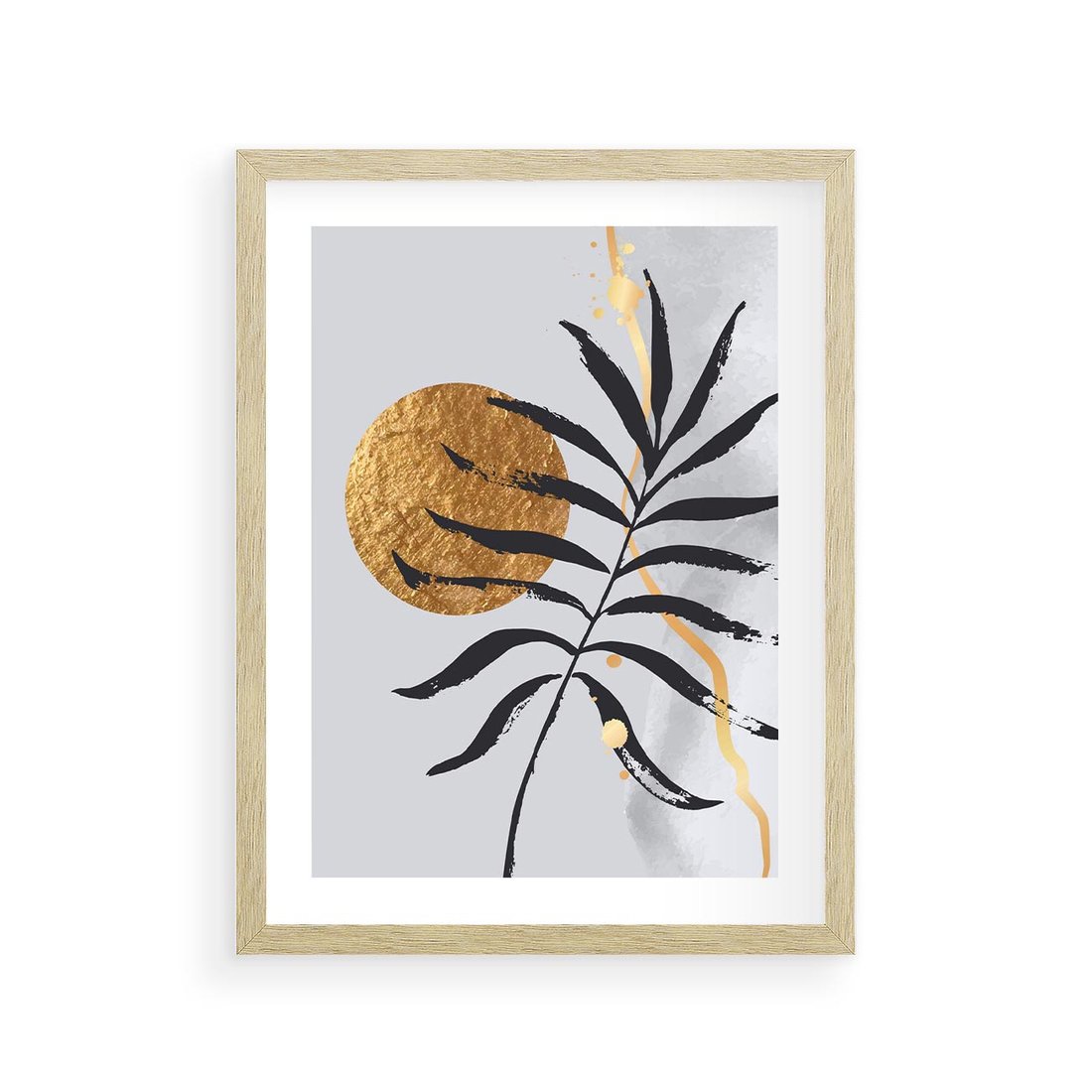 Plakat w ramie 30x40 - Grafika z Czarnym Liściem Palmy - czarny liść palmy, złóte kołó - rama drewno