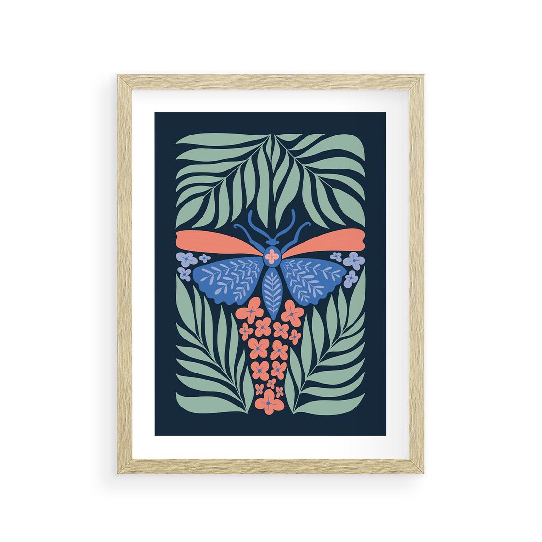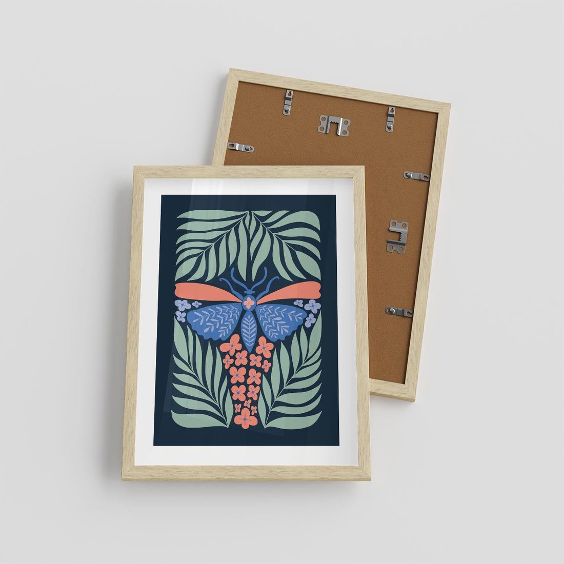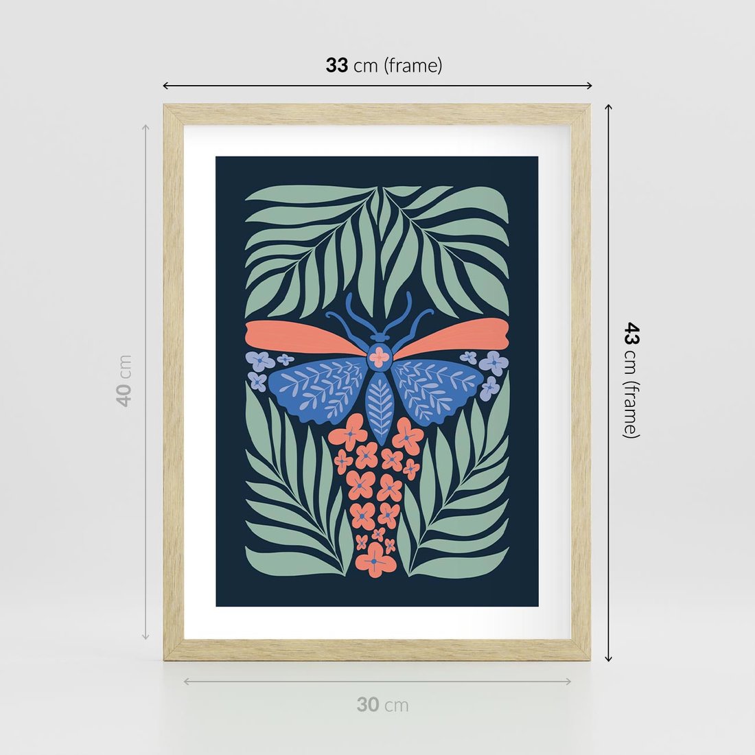 Plakat w ramie 30x40 - Granatowa Noc - granatowe tło, abstrajcyjna ćma - rama drewno