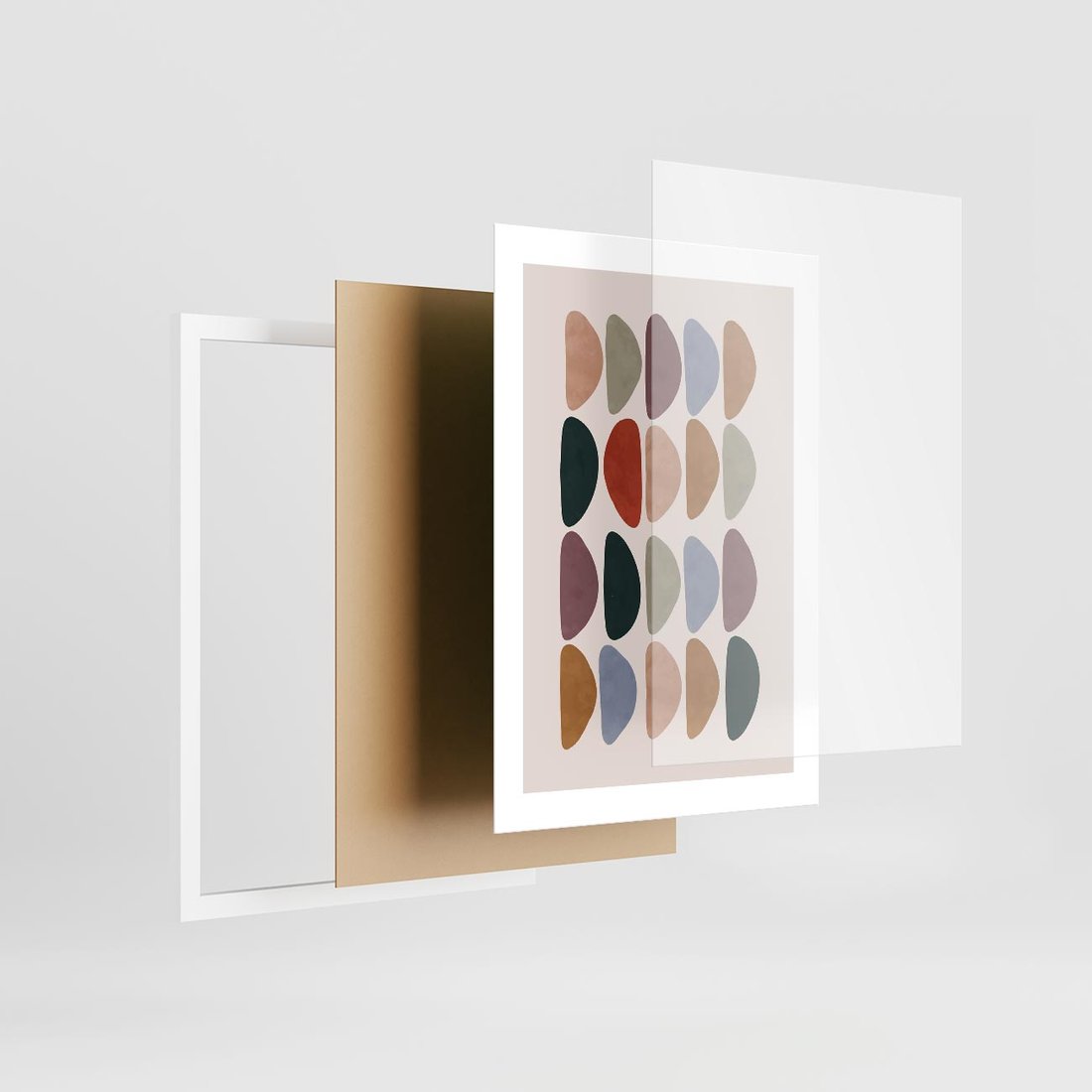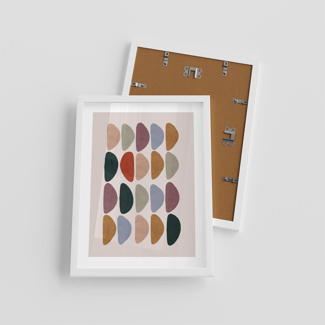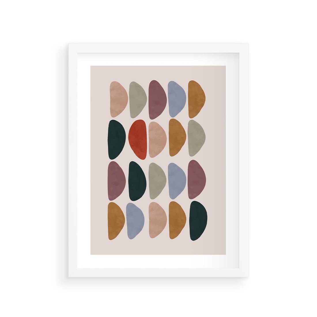Ten abstrakcyjny obraz prezentuje geometryczną kompozycję w stylu boho. Kształty i linie tworzą harmonijną równowagę, a delikatne odcienie kolorów dodają mu charakterystycznego uroku. To idealny plakat, który wprowadzi subtelność i wyjątkowość do każdego wnętrza.