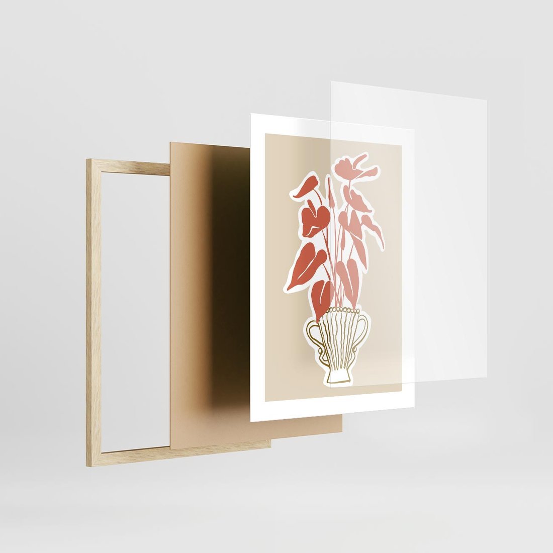Ten nowoczesny plakat prezentuje abstrakcyjne kwiaty i liście w eleganckiej kompozycji. Sztuka ta łączy naturę z nowoczesnością, tworząc piękną i wyrazistą dekorację, która dodaje przestrzeni subtelności i klasy.