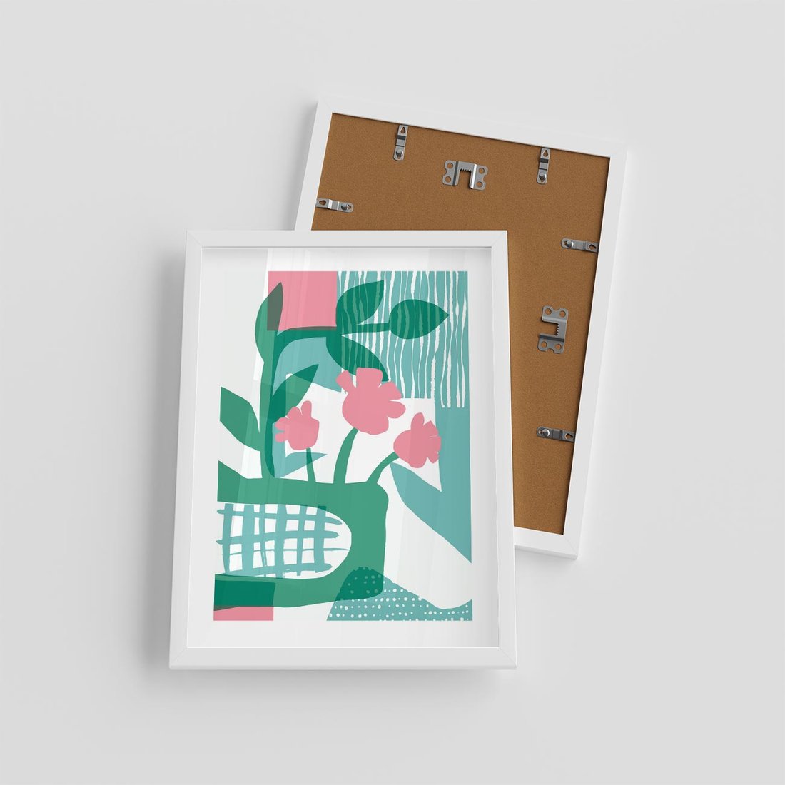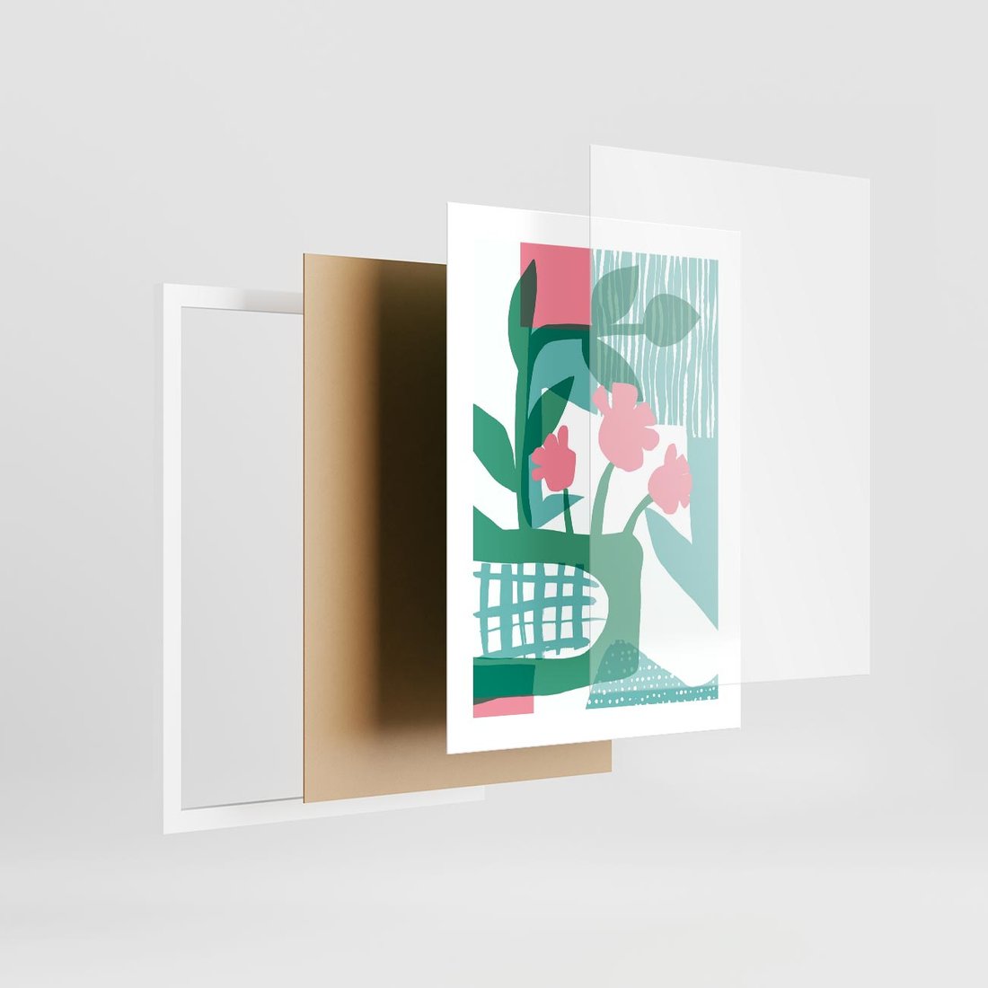 Nowoczesna sztuka w postaci abstrakcyjnych, pastelowych kwiatów o delikatnych odcieniach zieleni i różu, tworzących unikalną kompozycję.