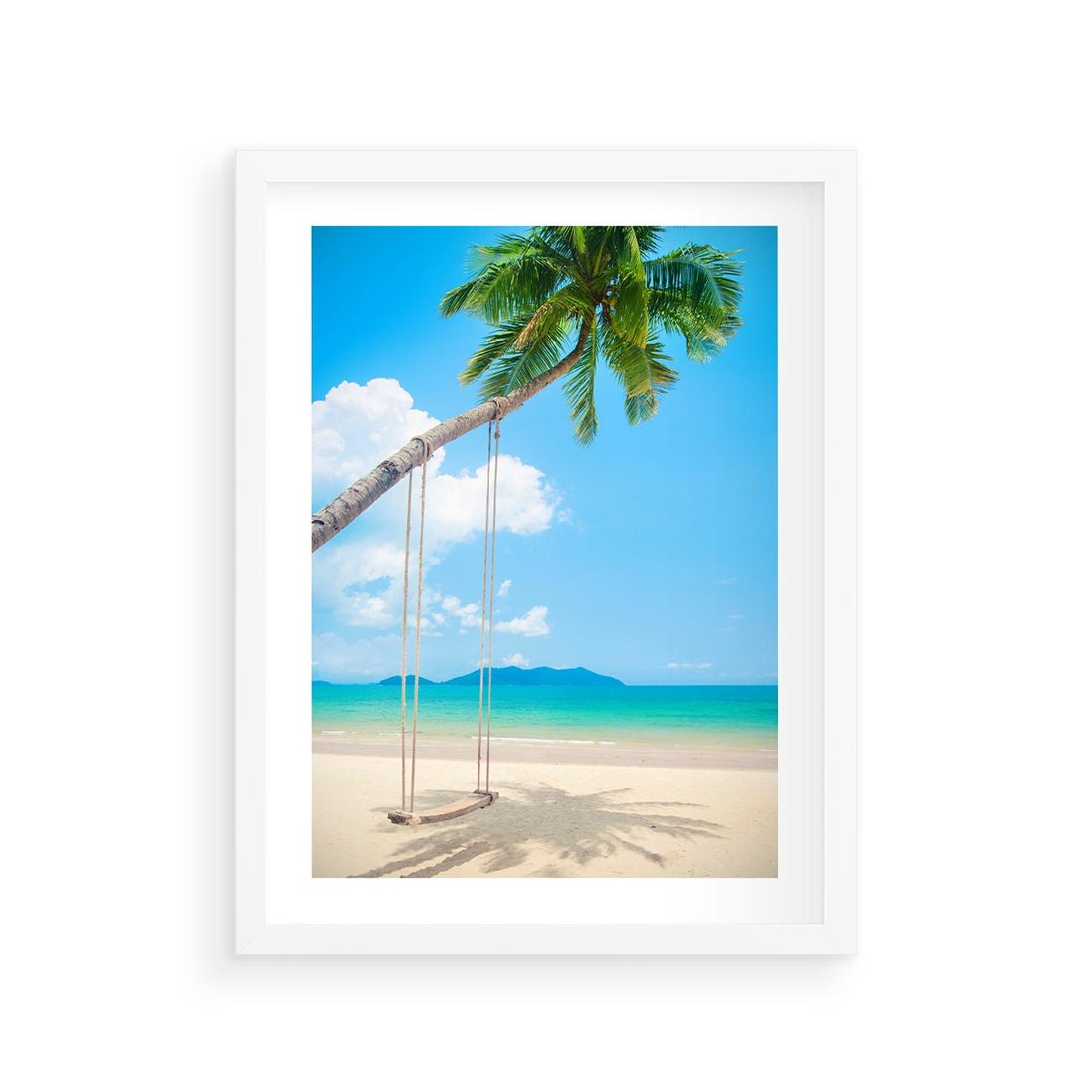 Plakat w ramie 30x40 - Hawajska palma i huśtawka na plaży - palma, huśtawka - rama biała