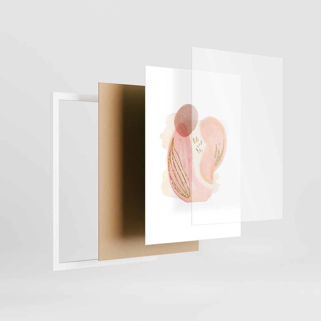 Abstrakcyjne akwarelowe plamy w minimalistycznym stylu. Subtelne pastele złagodzone złotymi elementami tworzą spokojną i wyrafinowaną kompozycję.