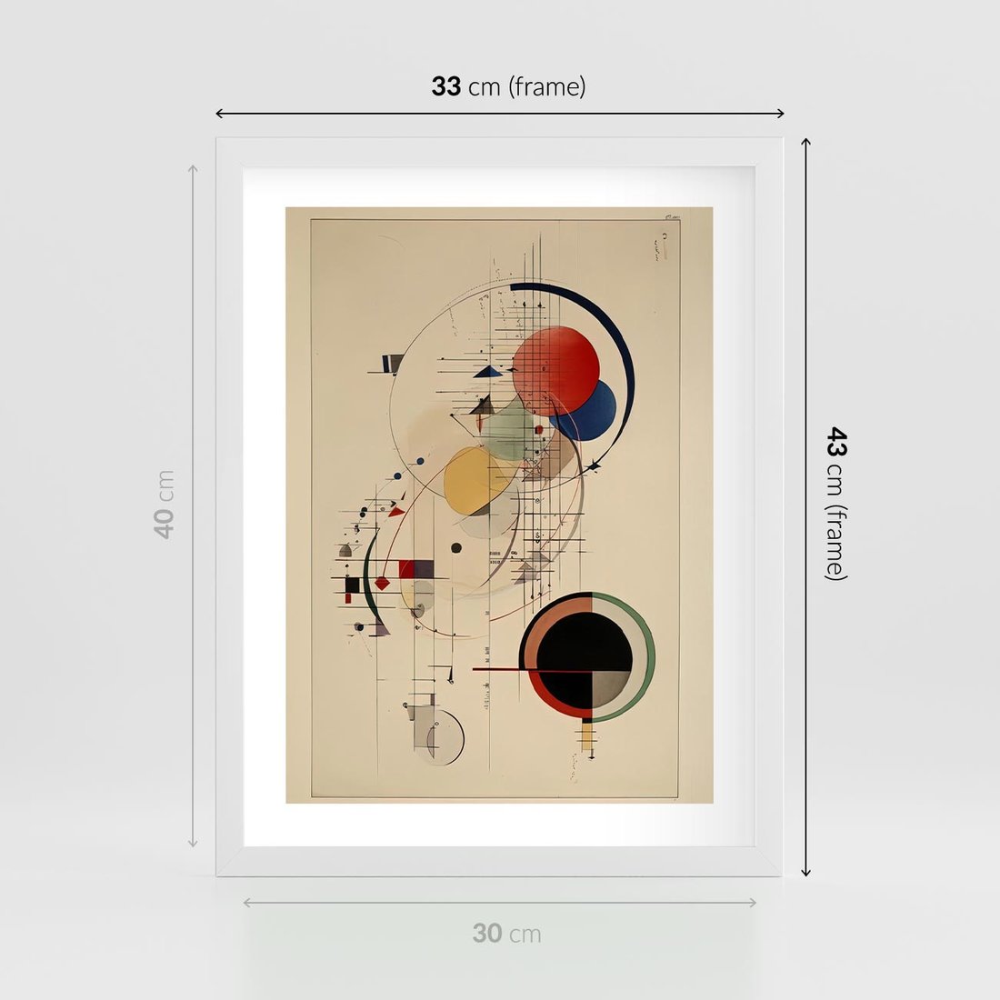 Plakat w ramie 30x40 - Impulsy Wydobyte z Cienia - abstrakcyjna geometryczna kompozycja, koła linie - rama biała